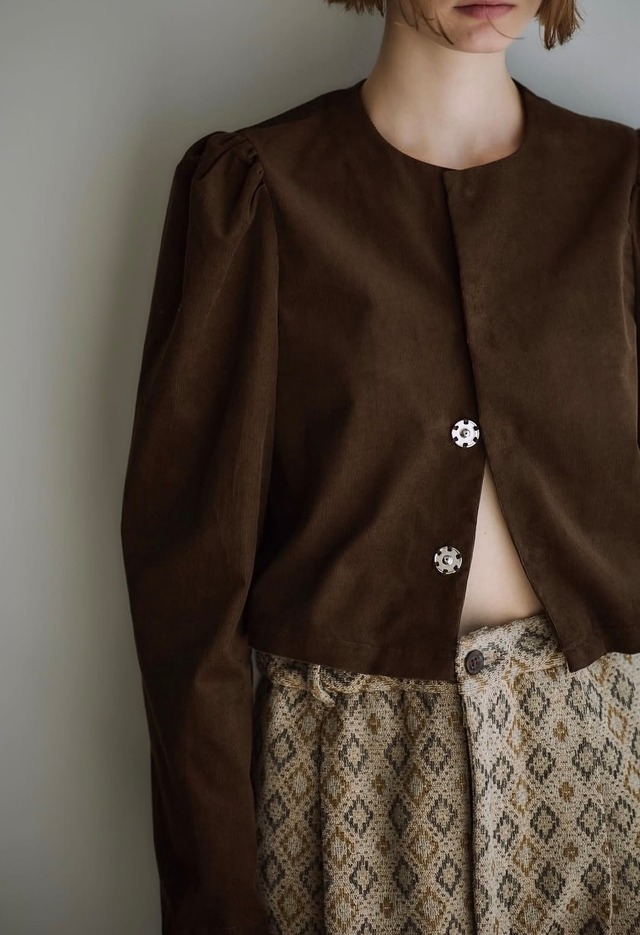 国内唯一のコーデュロイの産地、遠州地区でキバタからパイルカット、染まで一貫して生産されたコーデュロイ素材。 毛羽立ちの少ないよう不純物を取り除いたコットン糸を使用した極細の上品なシャツコールは保温性に優れており、ビクトリアン風の肩に大きくボリュームをつけ、前肩に袖をつけているので、着用した時にも綺麗でモダンな印象に。 フロントにはあえて大きいスナップボタンをつけ、全て閉めてもまた開けて折り返してもいいデザインにしています。 ブラウスですがジャケットのような存在感もありスタイリング次第で多様に楽しめます。 color BROWN BLACK 素材 COTTON 100% 原産国 日本 size 1 天幅 15cm 肩幅 34cm 袖丈 64cm 裾幅 48cm 着丈 44cm 着用スタッフ身長164cm ----------------------------------------------------------------------------------- 実店舗との同時販売を行っておりますので ご注文を頂いたお品をご用意できない場合もございます。 予めご了承くださいますようお願いいたします。 銀行振込をご希望の方は直接店舗へDMにてお問い合わせください。 [配送について] ご注文のお品は佐川急便にてお送り致します。 お受け取りのご希望日時がございます場合は、必ずご注文時に「備考欄」より申し付けください。記載のない場合はご入金より3日以内に指定なしにて発送させて頂きます。 [返品・交換について] お客様都合の返品・交換は不可になります。