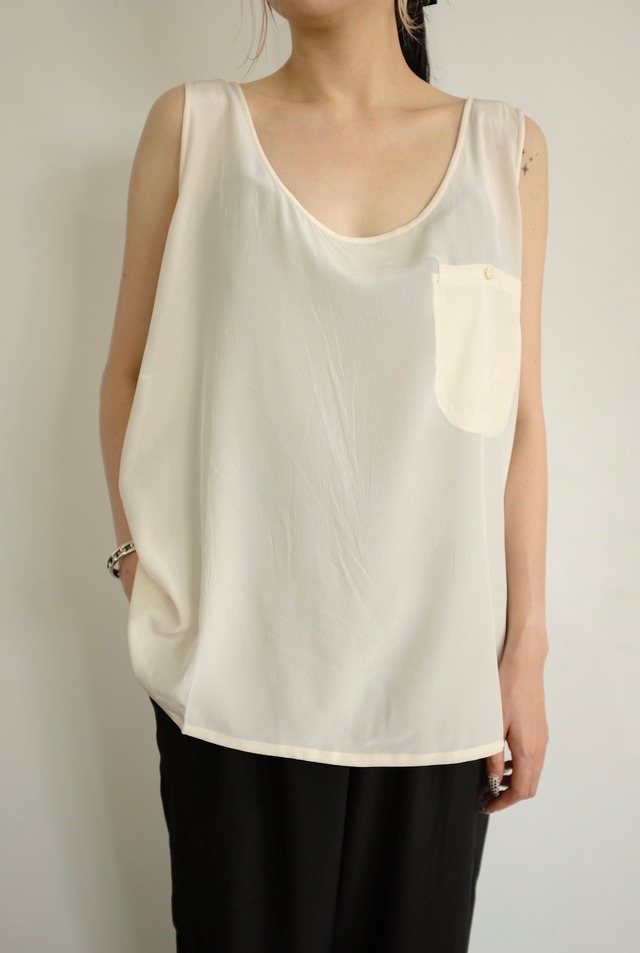とろみ感のあるシルク素材のノースリーブブラウス。 胸ポケットがポイントに。 オーバーサイズなのでさまざまな体型の方にお召しいただけます。 着ると見えませんが襟周りにうっすら汚れあり、画像7枚目ご参照ください。 サイズ 身幅59㎝ 着丈66㎝ アームホール幅29㎝ 着用モデル身長169㎝ 素材 シルク 生産国 中国 ----------------------------------------------------------------------------------- 実店舗との同時販売を行っておりますので ご注文を頂いたお品をご用意できない場合もございます。 予めご了承くださいますようお願いいたします。 銀行振込をご希望の方は直接店舗へDMにてお問い合わせください。 [配送について] ご注文のお品は佐川急便又はレターパックライトポスト投函にてお送り致します。 レターパックライトをご選択の際は日時指定不可となります。予めご了承くださいませ。 [USED/VINTAGE] こちらの商品はUSED/VINTAGE品です。 商品の特性上、コンディションは様々です。 その全てにストーリーを感じていただける方に。 [返品・交換について] USED商品は返品・交換不可になります。