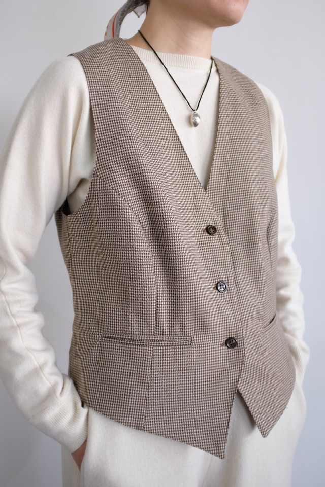 フランス買い付けの新入荷商品。 千鳥格子柄のウールジレ。 マニッシュなアイテムのジレですが、ブラウンカラーで柔らかな印象です。 薄手のウール生地なので春先も様々なスタイルが楽しめそうです。 color ブラウン 素材 ウール100% 裏地ポリエステル 原産国 フランス 肩幅 31cm 身幅 48cm 着丈 51cm 着用モデル身長164㎝ ----------------------------------------------------------------------------------- [配送について] ご注文のお品は佐川急便又はレターパックライトポスト投函にてお送り致します。 レターパックライトをご選択の際は、日時指定不可となります。予めご了承くださいませ。 実店舗との同時販売を行っておりますので ご注文を頂いたお品をご用意できない場合もございます。 予めご了承くださいますようお願いいたします。 銀行振込をご希望の方は直接店舗へDMにてお問い合わせください。 [USED/VINTAGE] こちらの商品はUSED/VINTAGE品です。 商品の特性上、コンディションは様々です。 その全てにストーリーを感じていただける方に。 [返品・交換について] USED商品は返品・交換不可になります。
