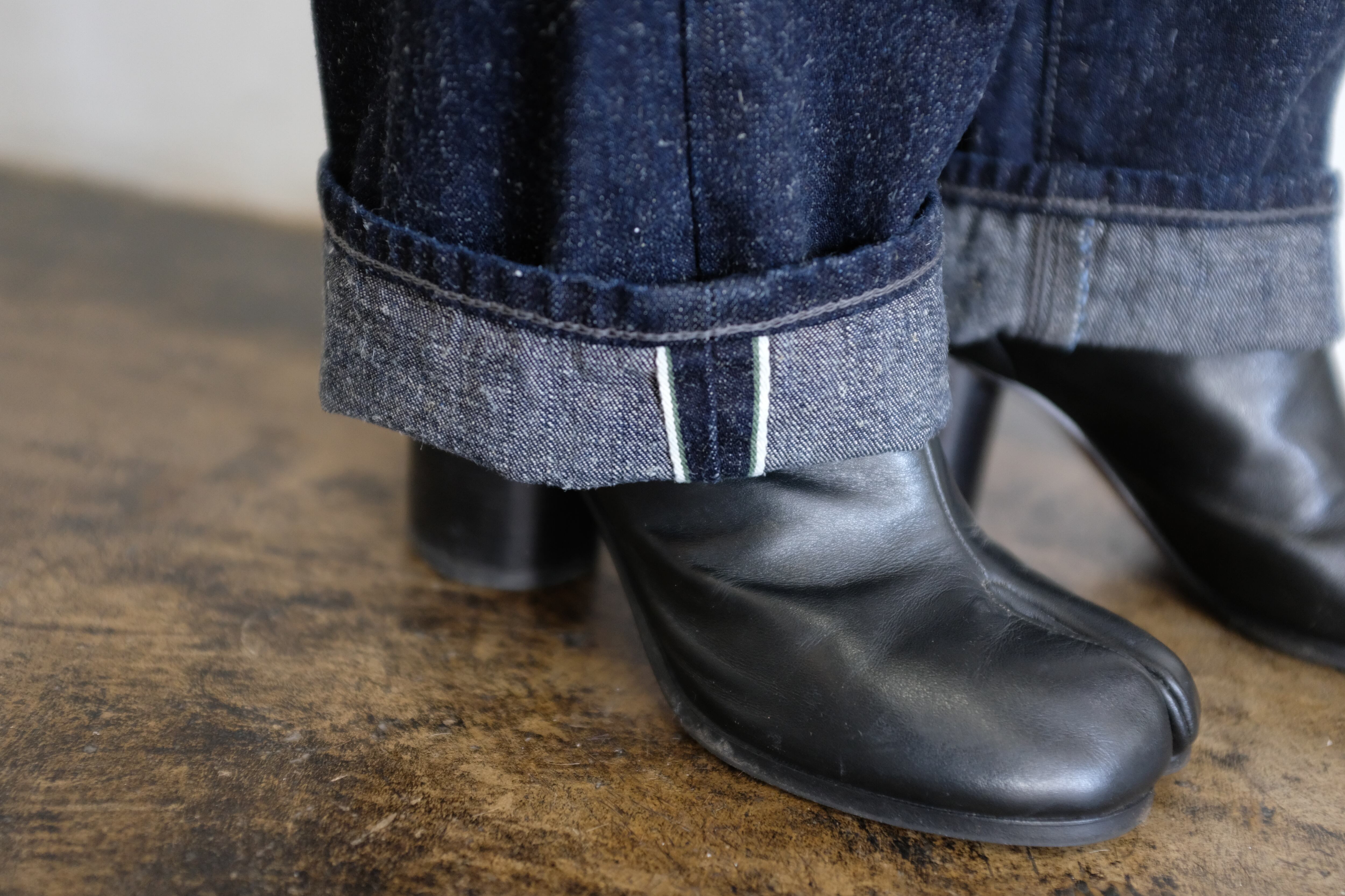 縦糸はロープ染色で本藍染を施し、緯糸にヘンプと綿の混紡糸を打ち込んだD.ingigoは系染色からオリジナルで作成したデニム生地。通常アカであることが多いミミがグリーンなところも◎