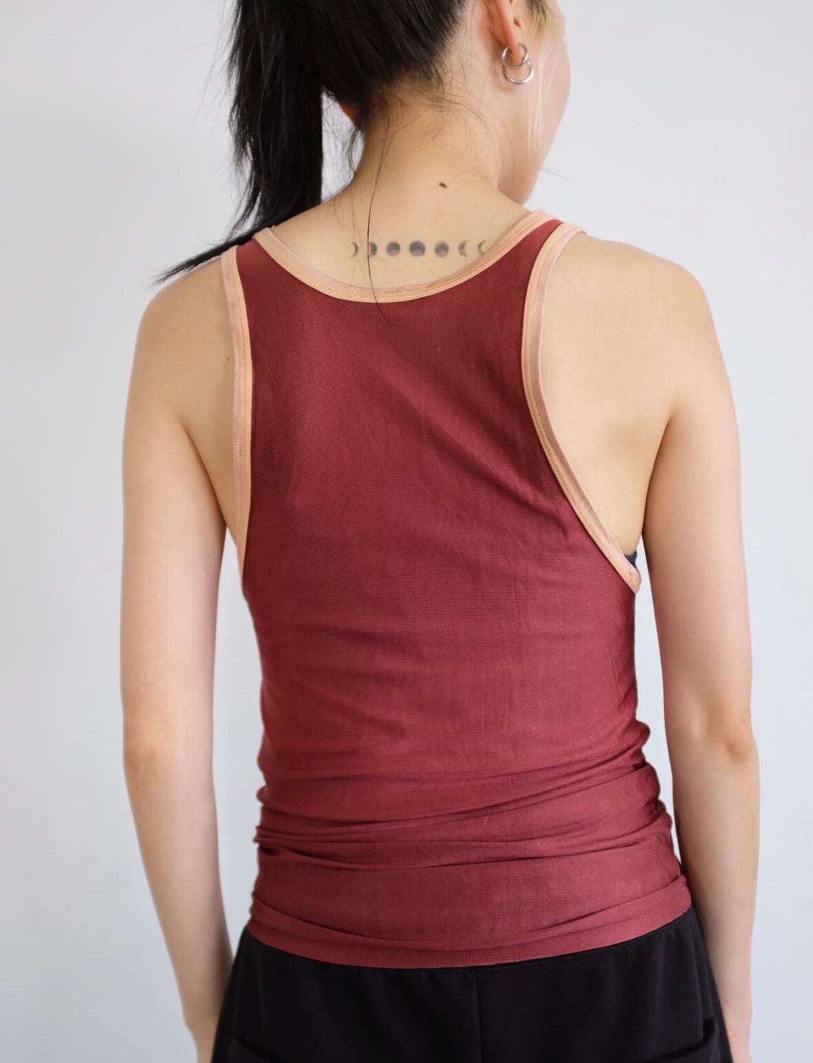 ヴィンテージらしい光沢感のある素材感のタンクトップ。