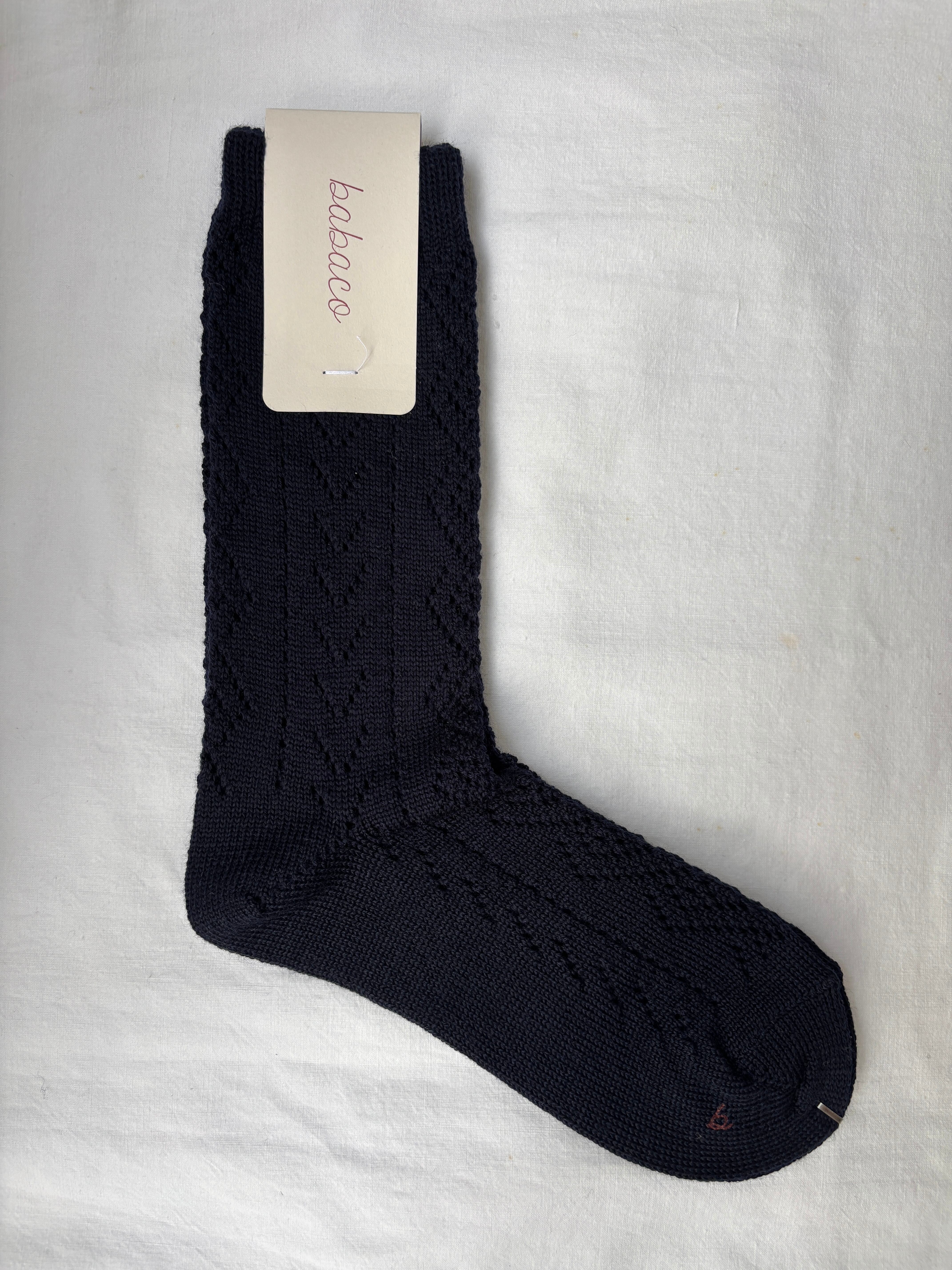 ニュージーランドメリノ防縮ウールで編んだクラシカルなアイレット柄のソックス。