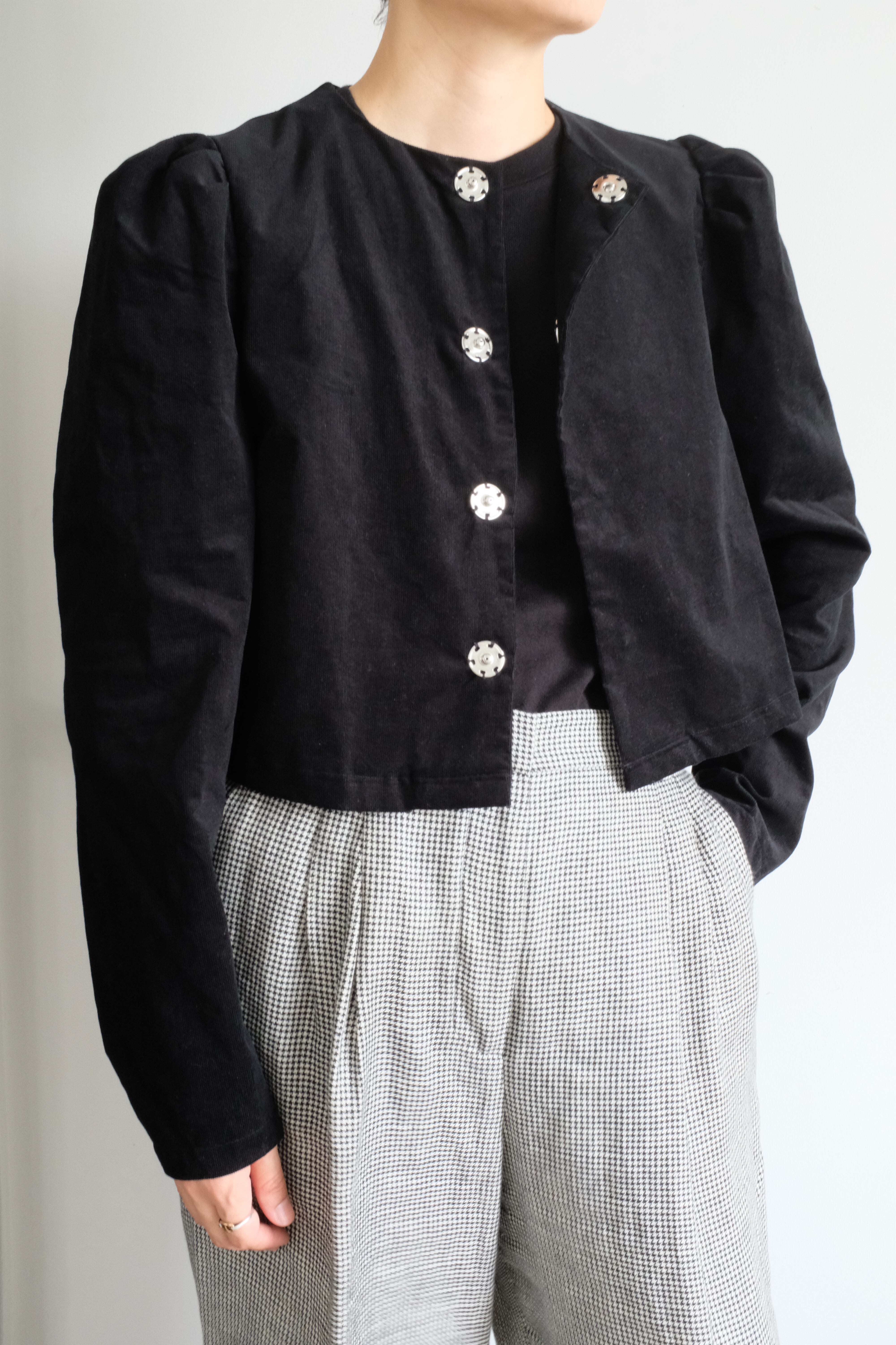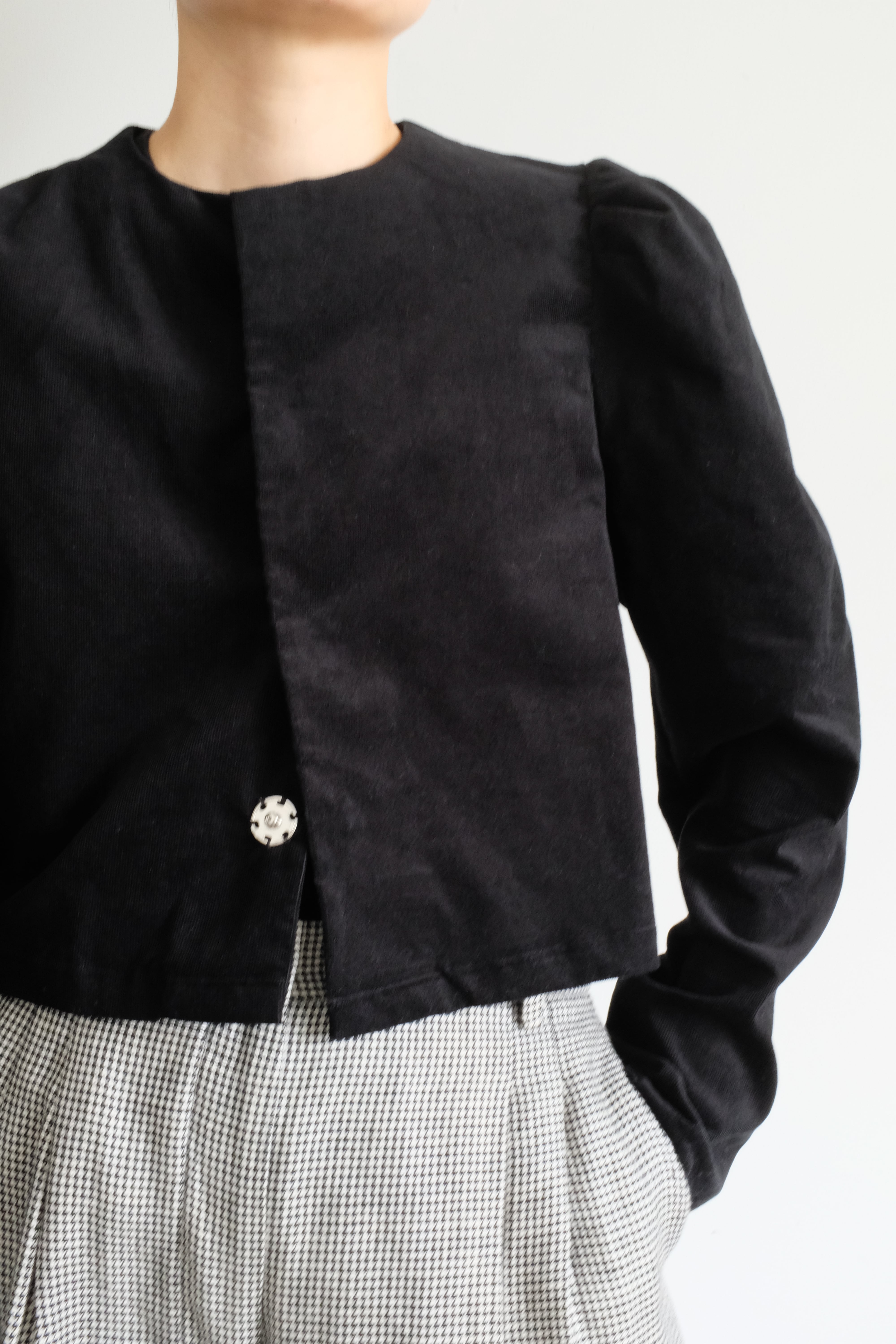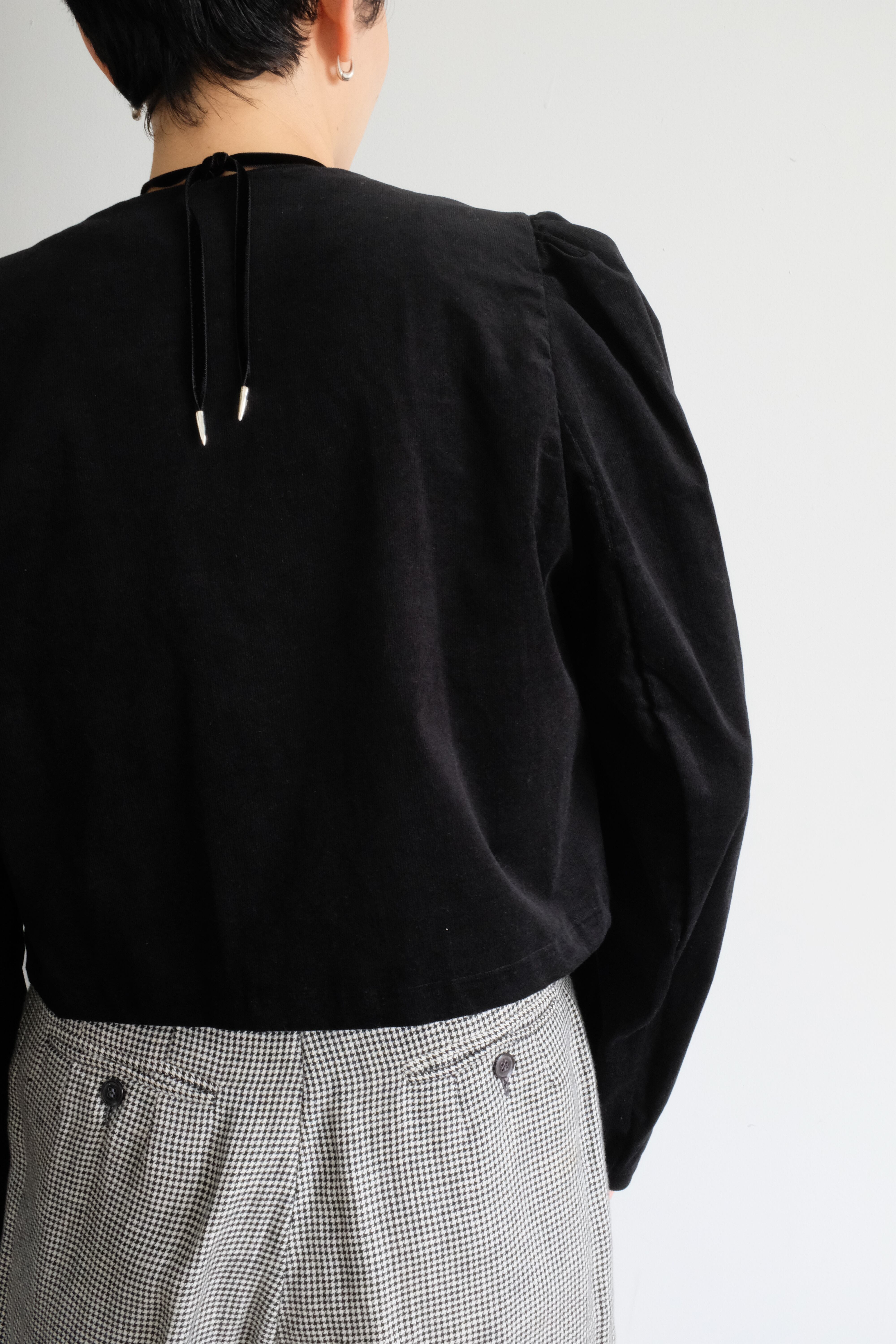 毛羽立ちの少ないよう不純物を取り除いたコットン糸を使用した極細の上品なシャツコールは保温性に優れており、ビクトリアン風の肩に大きくボリュームをつけ、前肩に袖をつけているので、着用した時にも綺麗でモダンな印象に。 フロントにはあえて大きいスナップボタンをつけ、全て閉めてもまた開けて折り返してもいいデザインにしています。