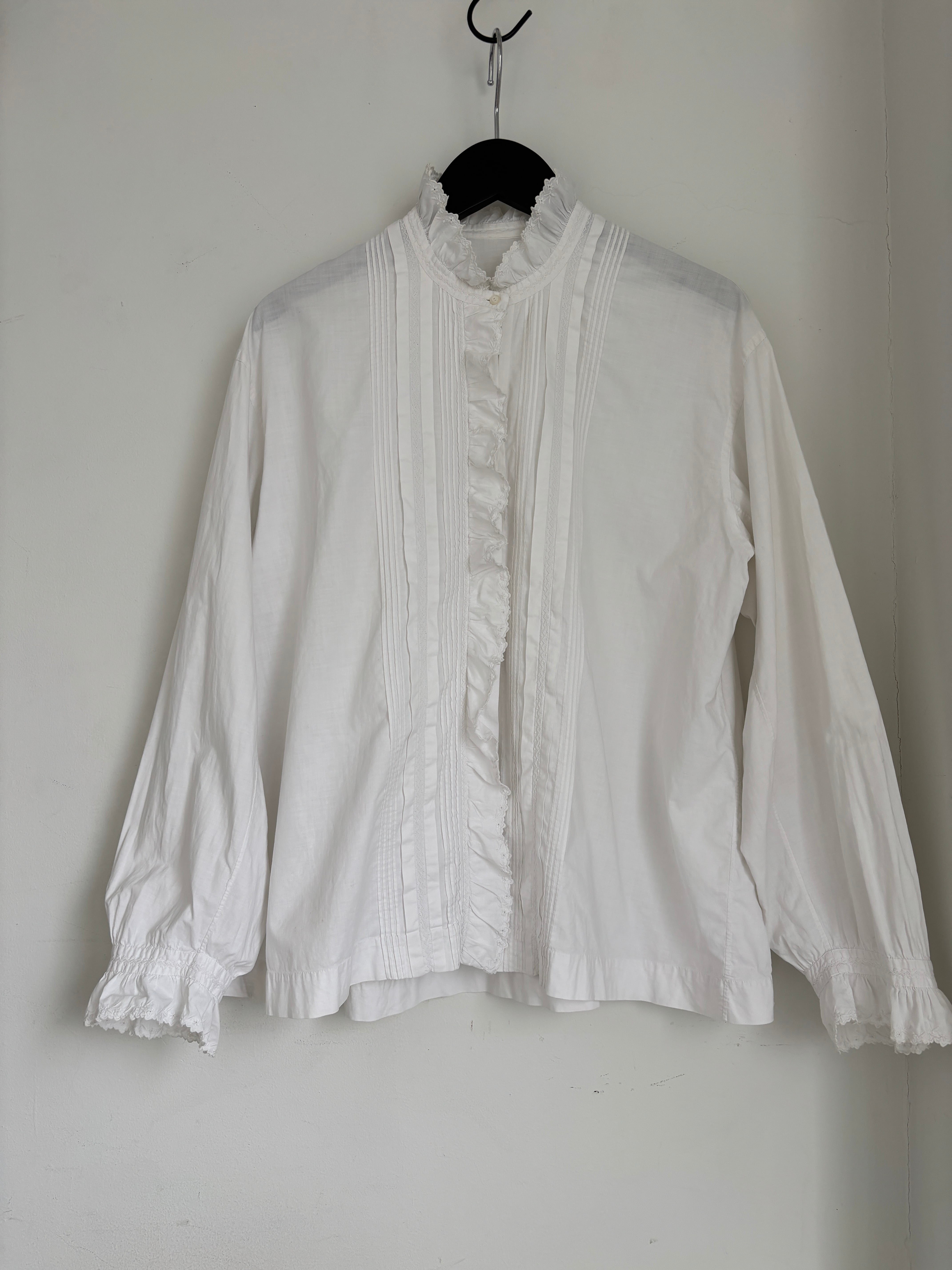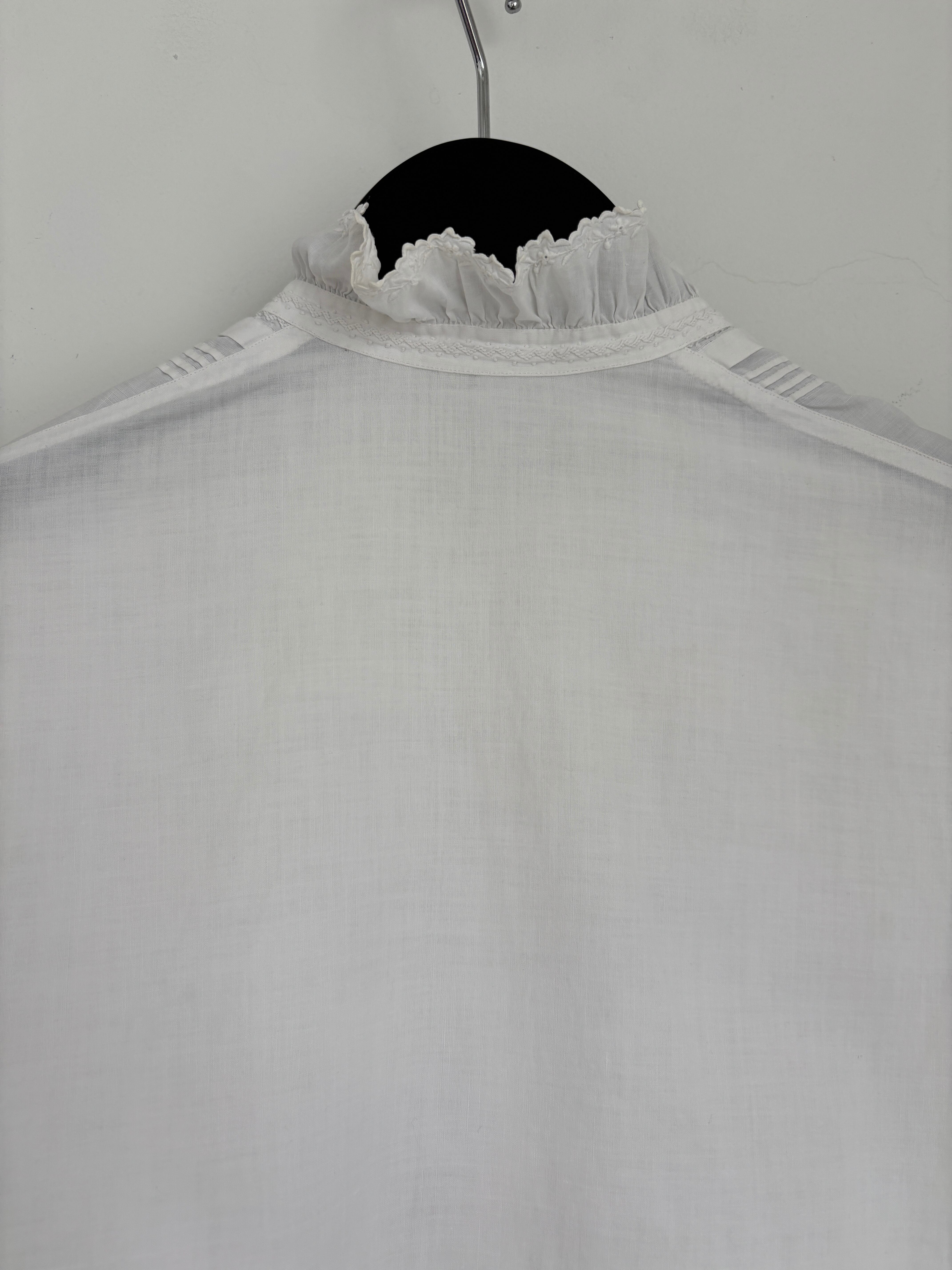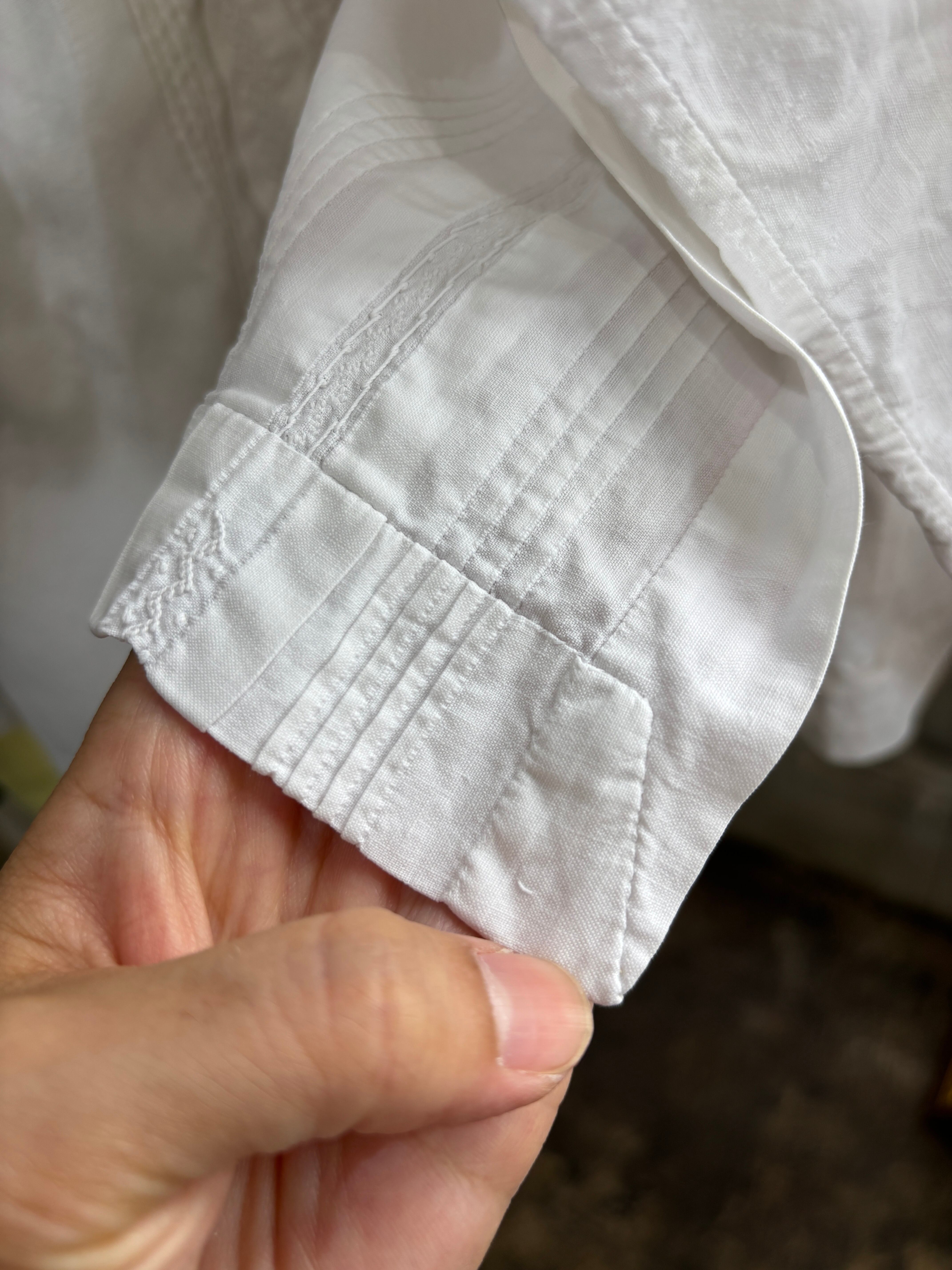 襟や袖のレースや刺繍、胸元のプリーツが大変美しく、手仕事を感じられる一着。