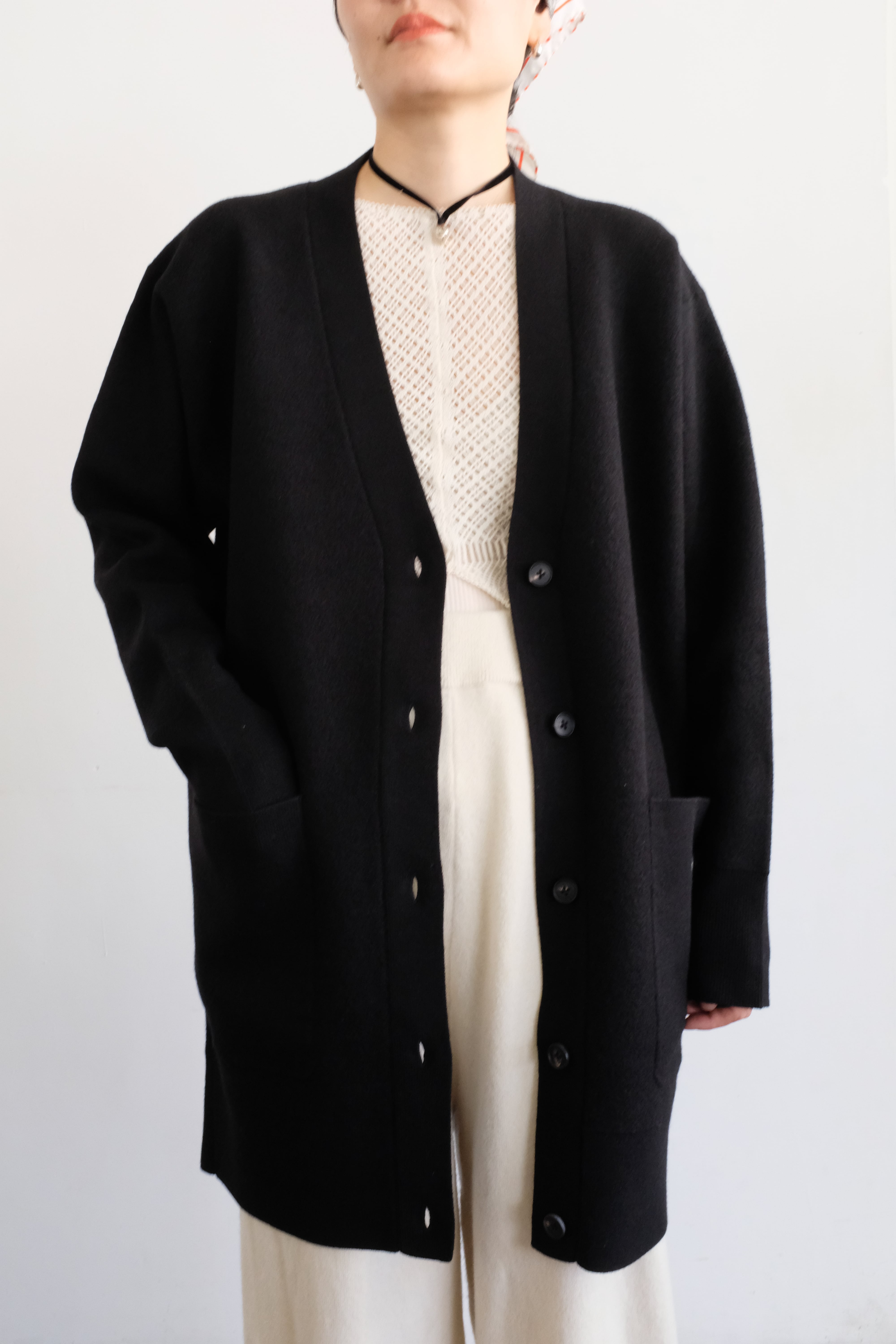 コートのように羽織れる重厚感とウエストサイドのボタンでツイスト着用もできる二面性カーディガン。軽いのですが保温性も高くしっかりとアウターとしても機能してくれます。