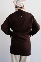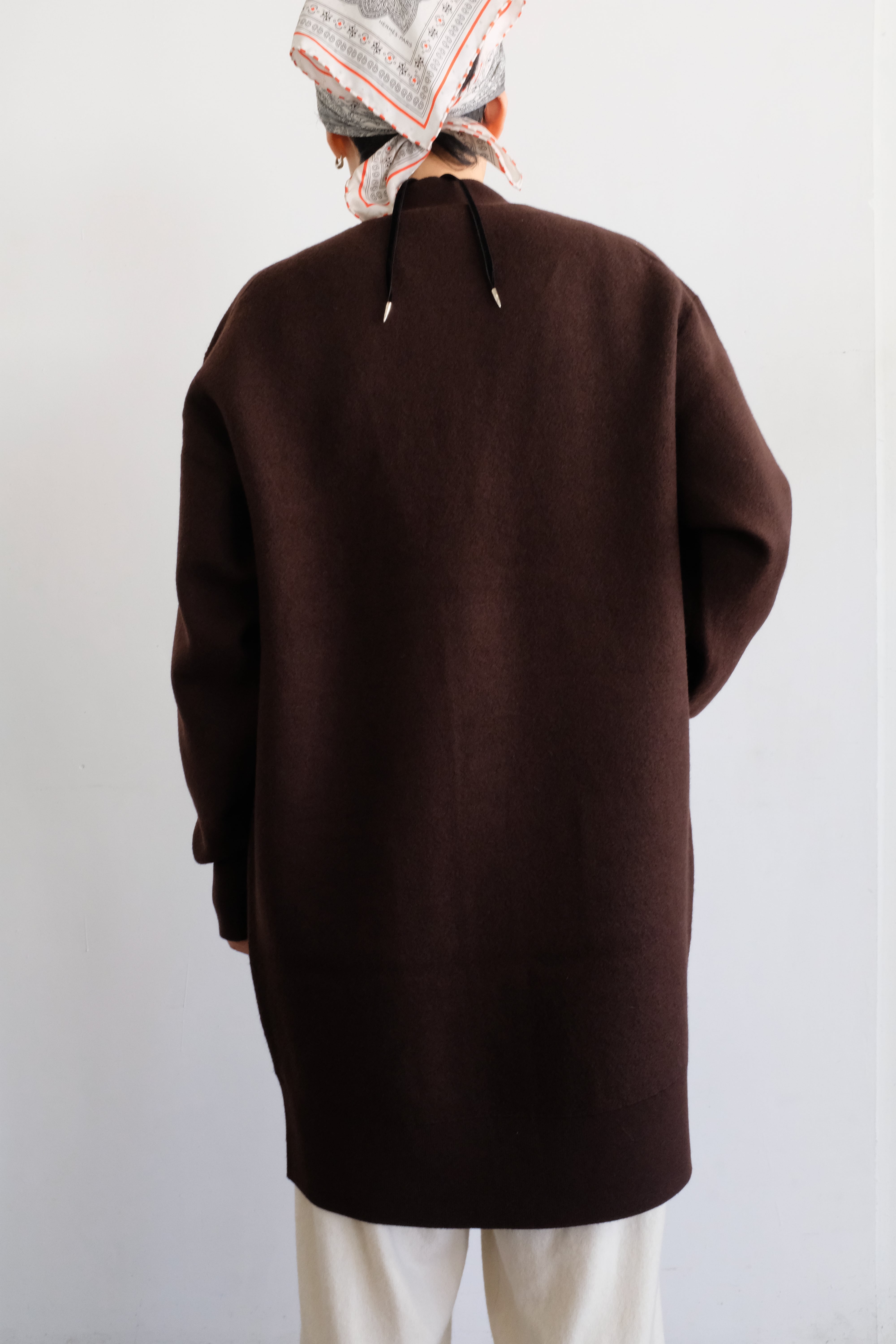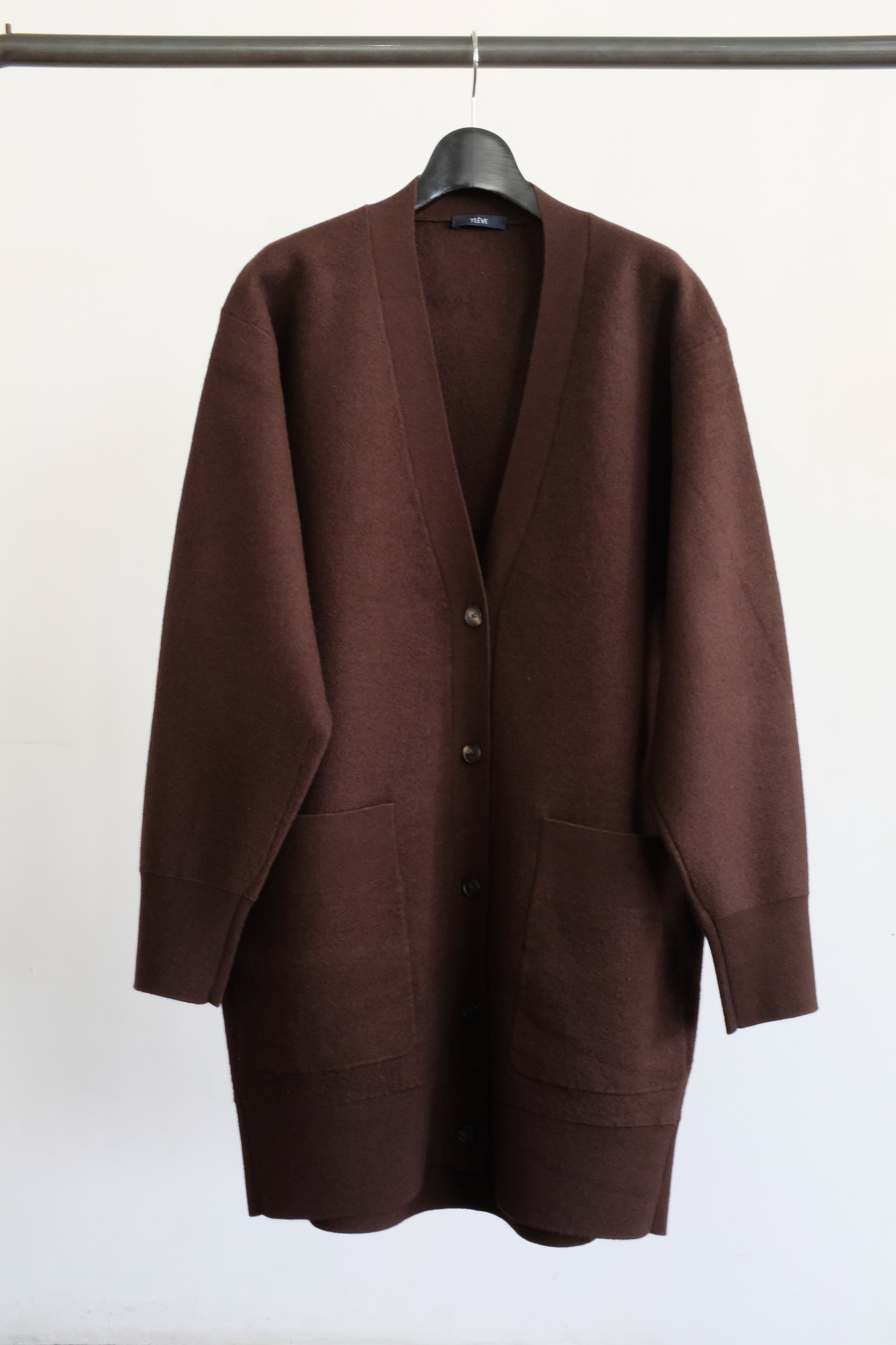 コートのように羽織れる重厚感とウエストサイドのボタンでツイスト着用もできる二面性カーディガン。