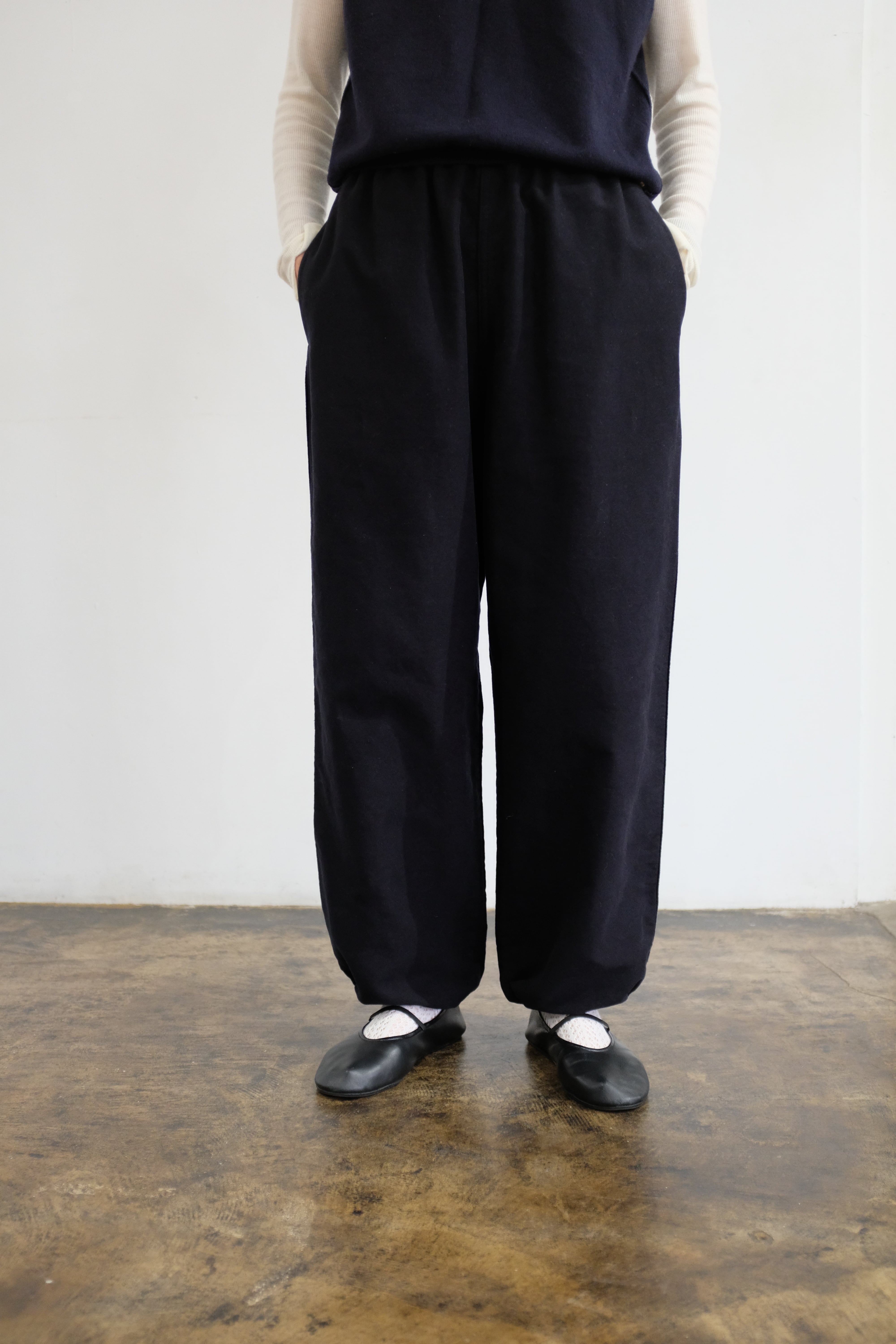 イージーパンツですがカジュアル過ぎず綺麗めな印象で着ていただけます。