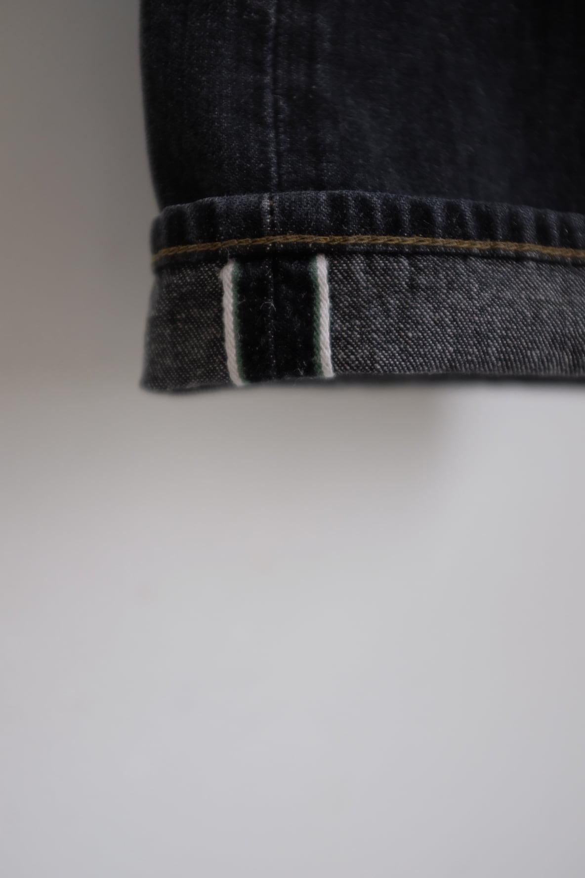 縦糸はロープ染色で本藍染を施し、緯糸にヘンプと綿の混紡糸を打ち込んだD.ingigoは系染色からオリジナルで作成したデニム生地。通常アカであることが多いミミがグリーンなところも◎