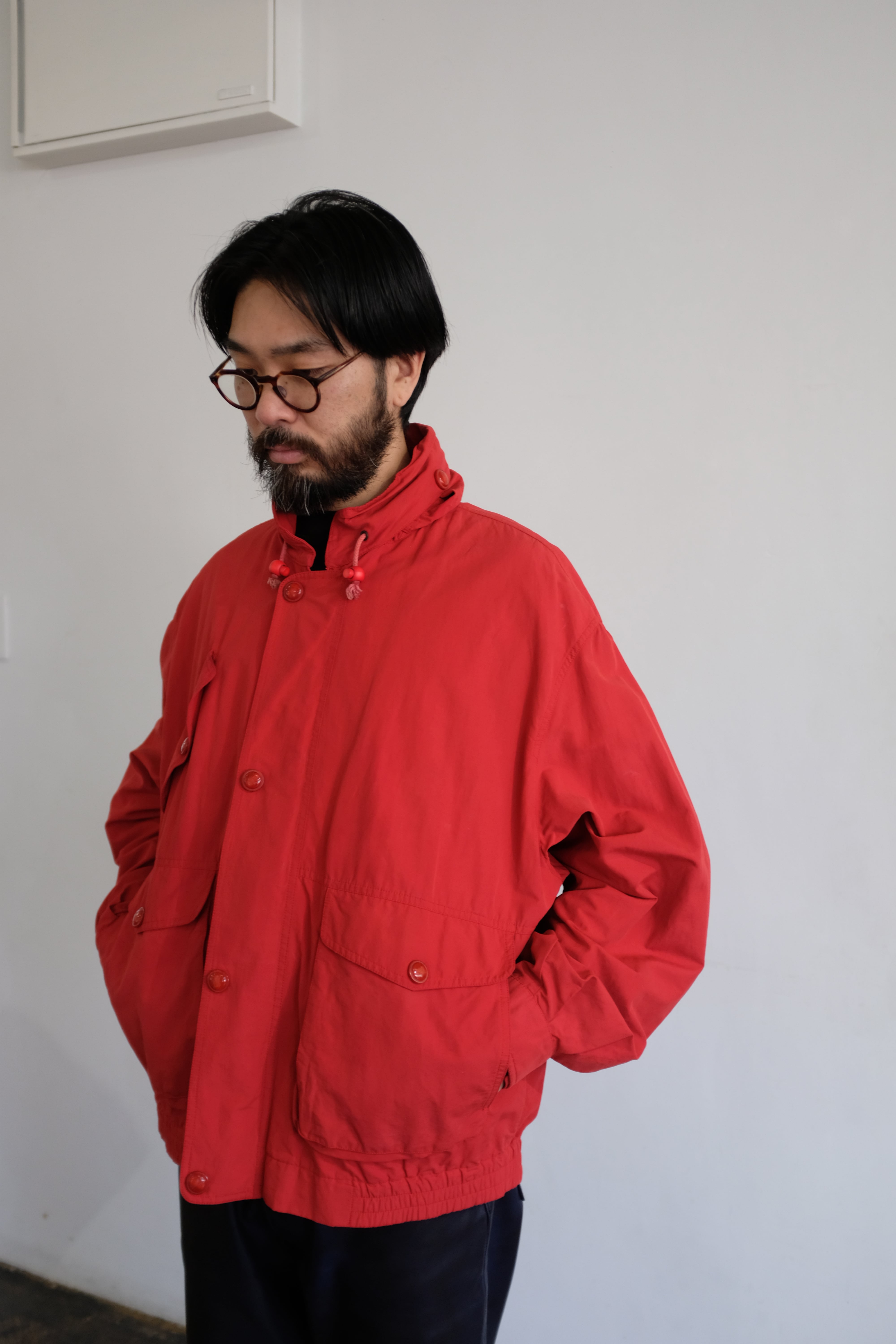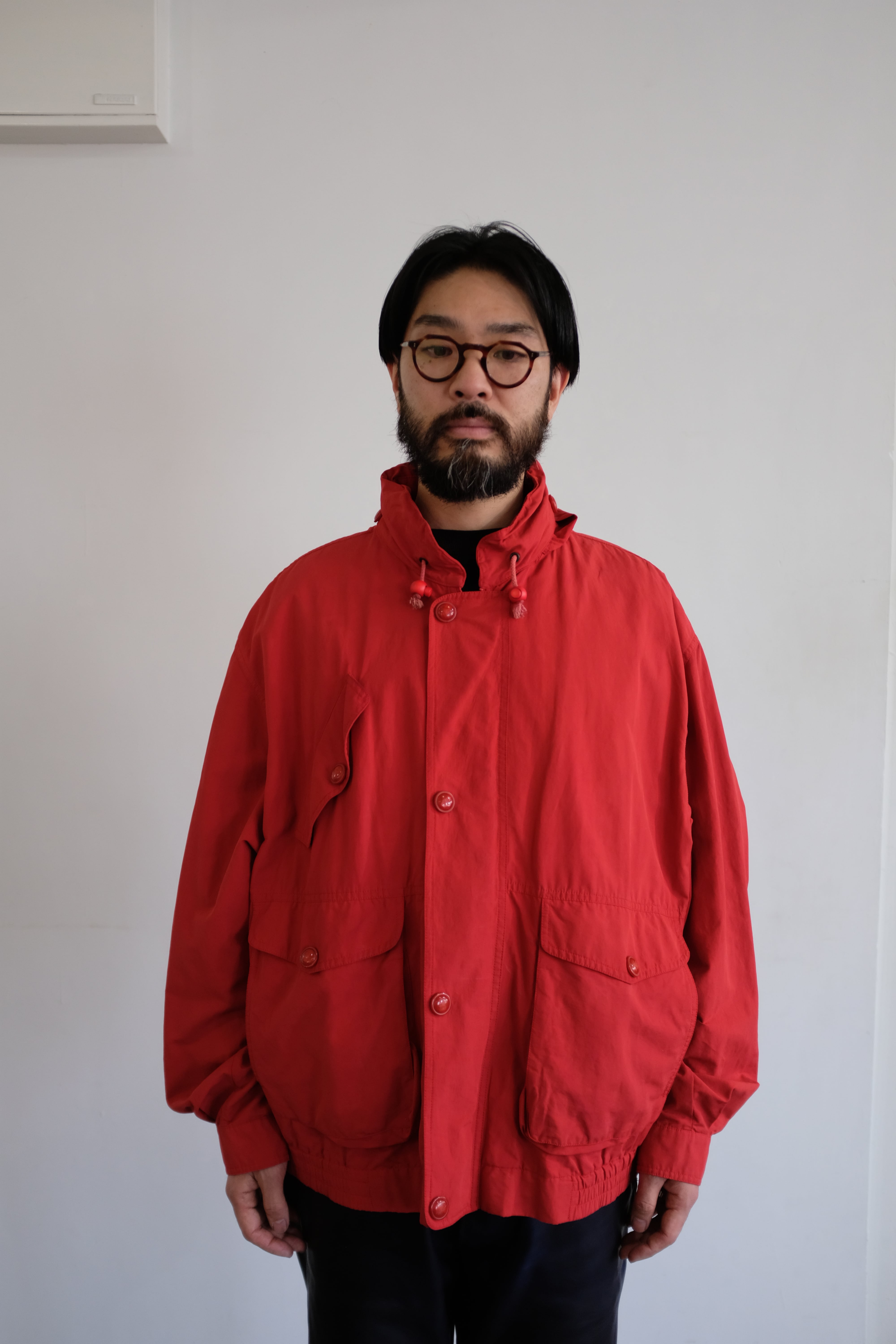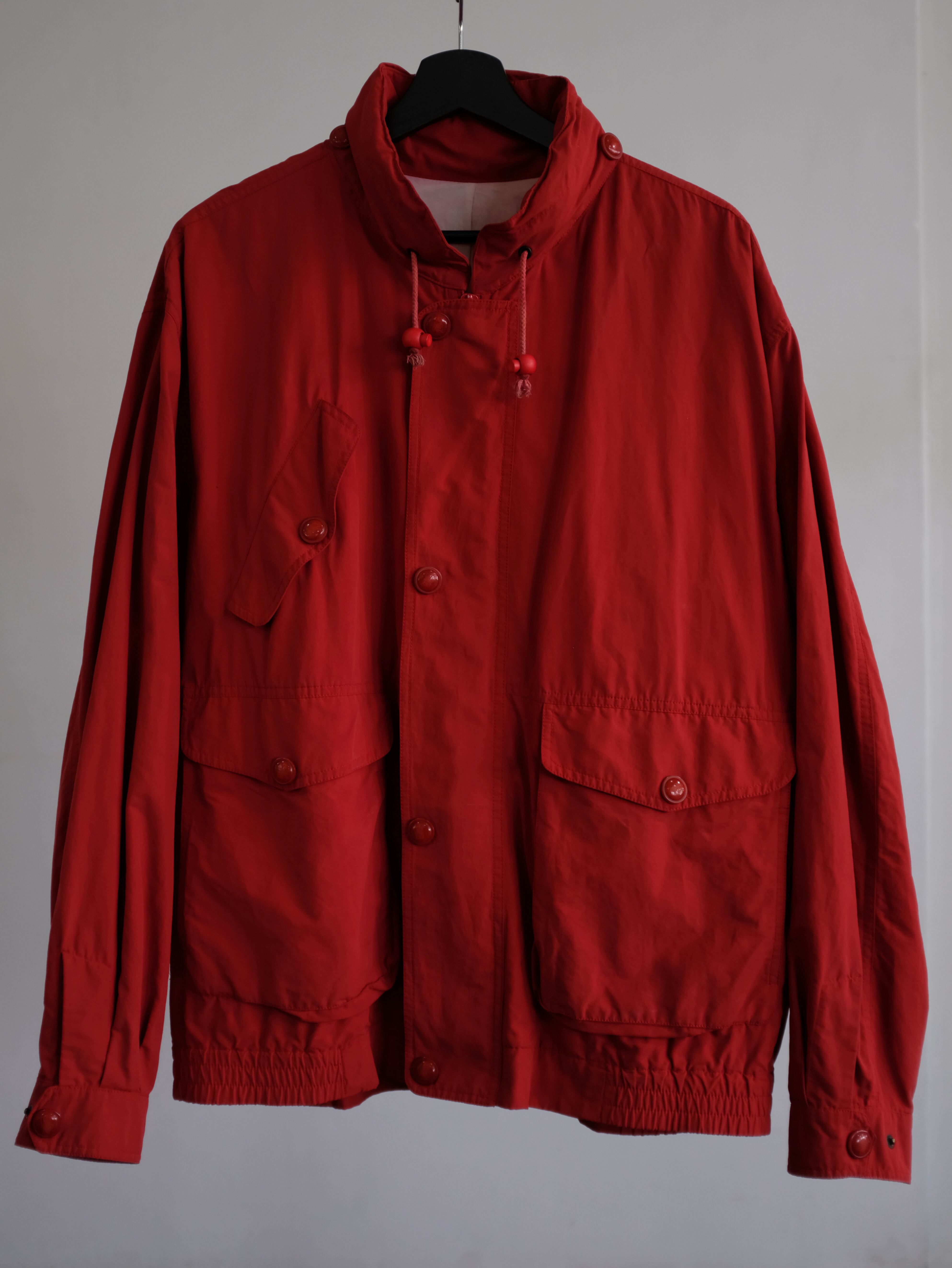 太短いバランス、コットンナイロン生地で発色の良いレッドカラーが素敵な一着。