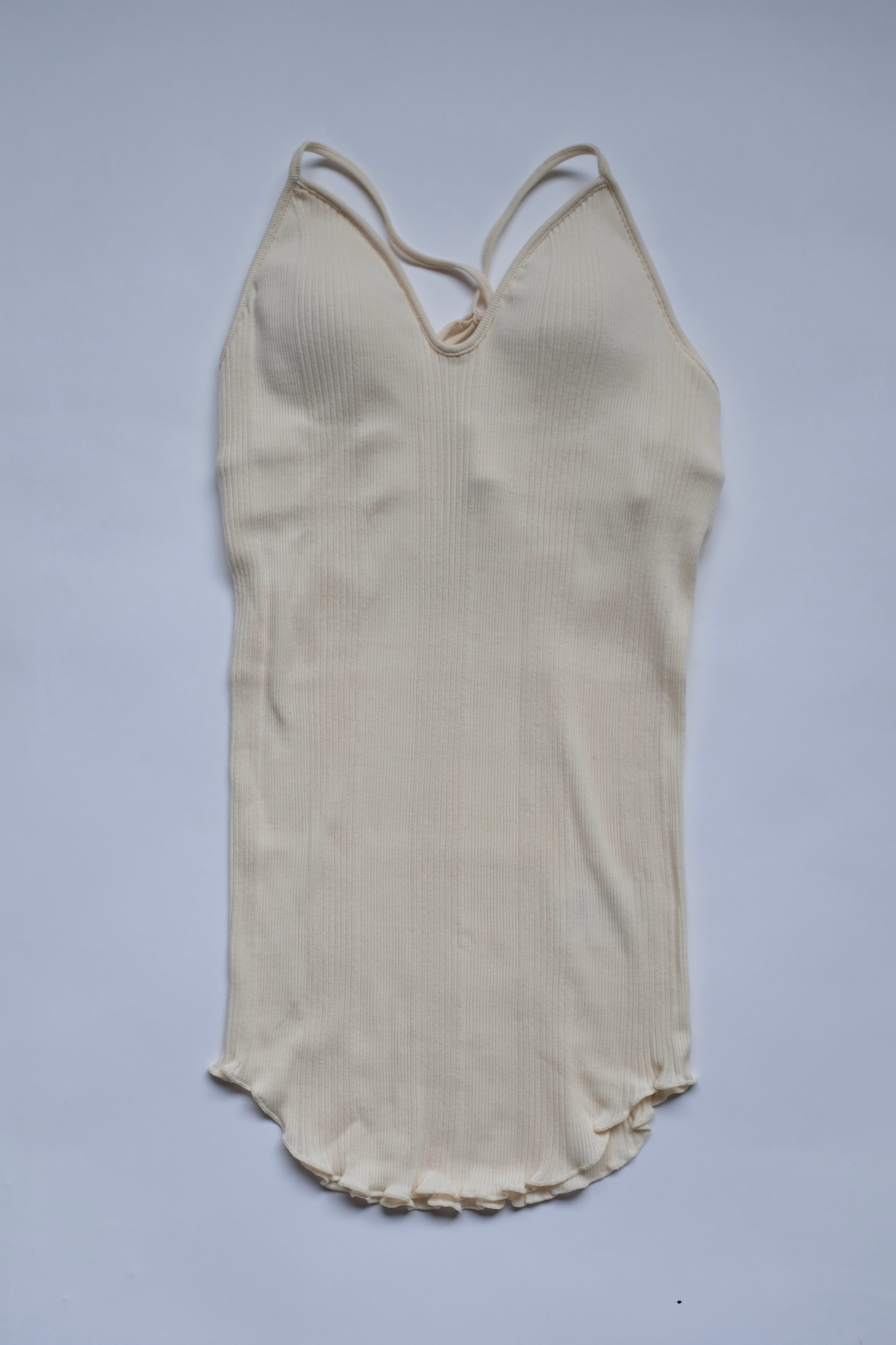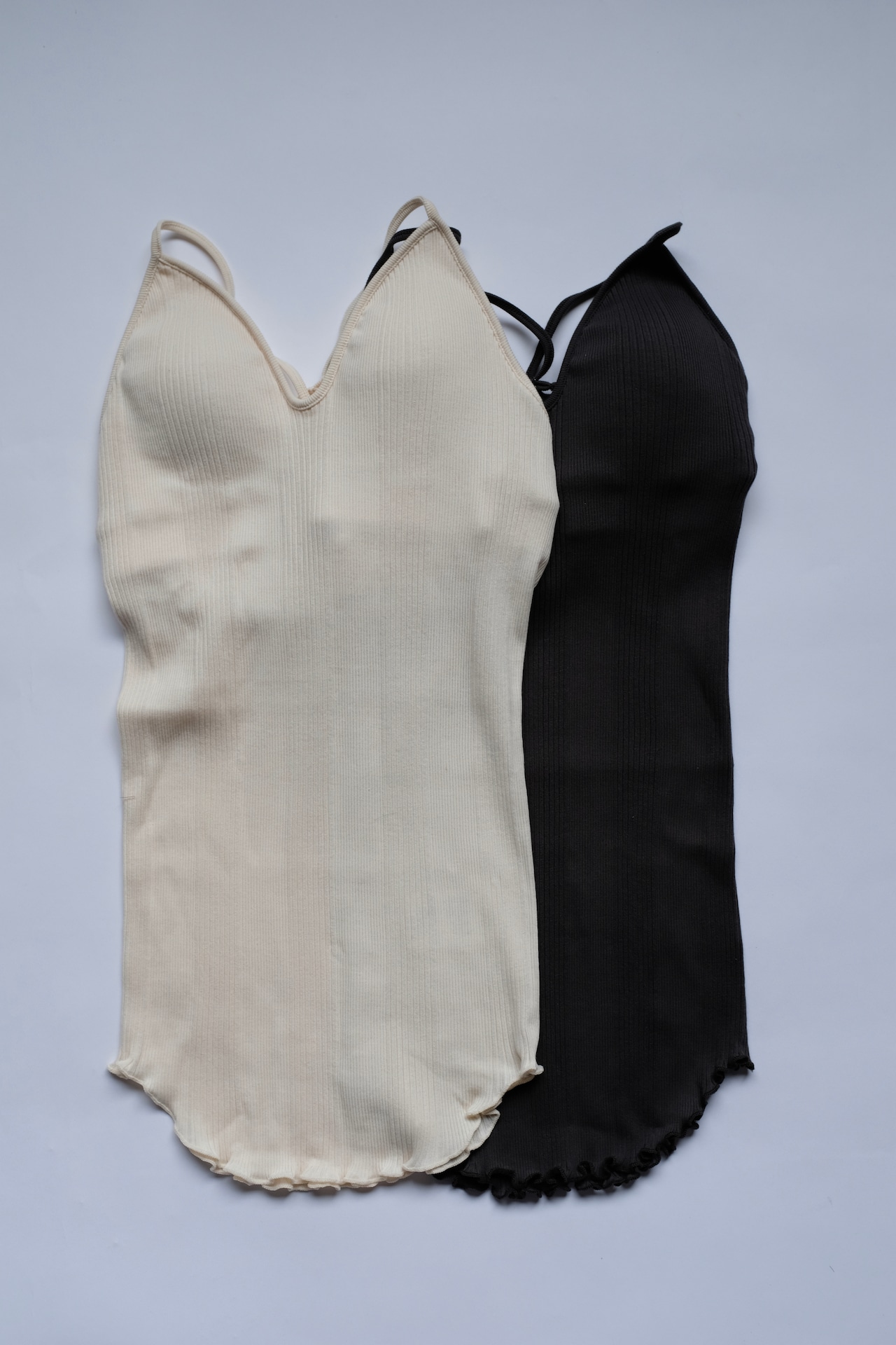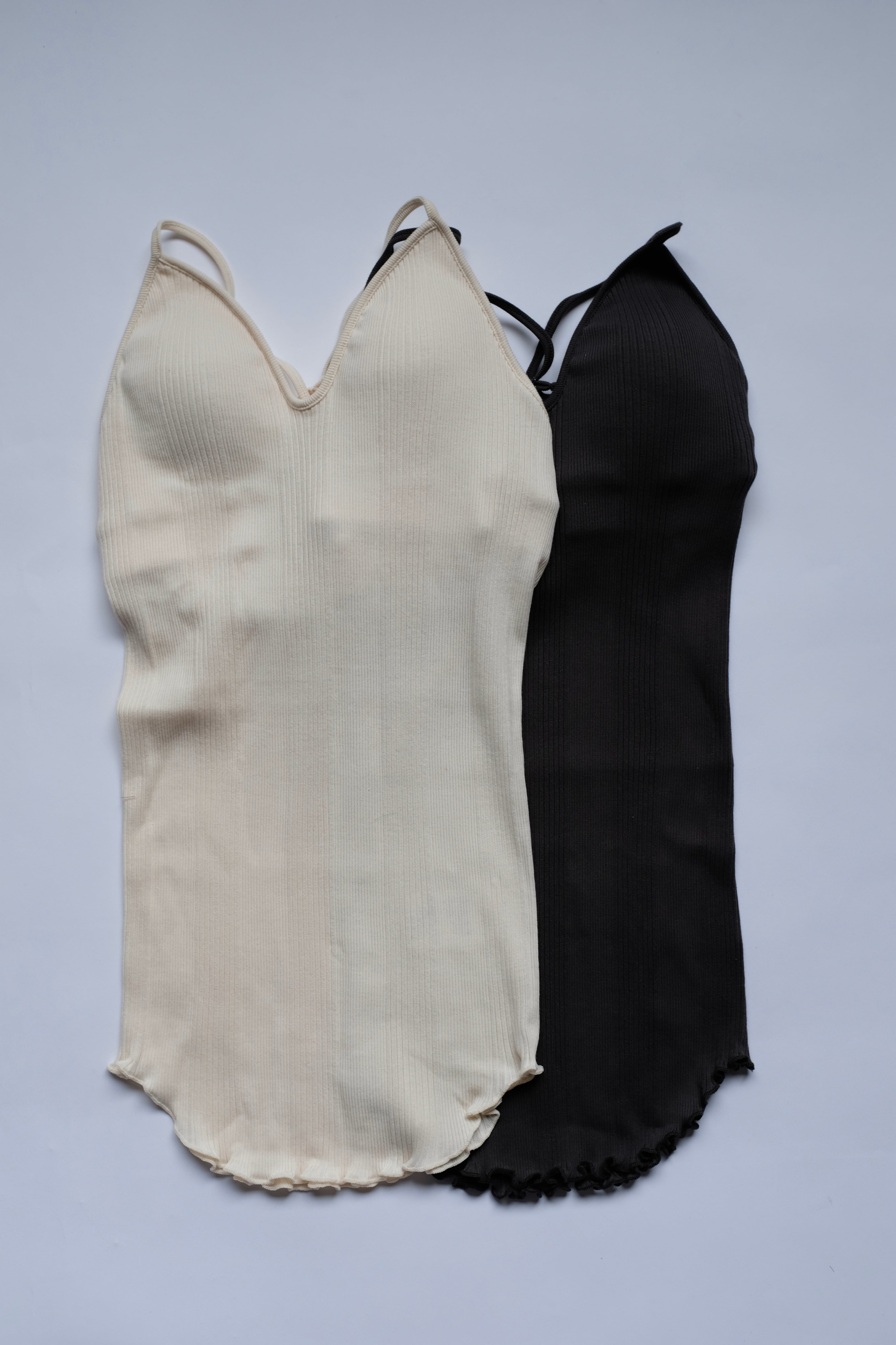 繊細さを失わず、伸縮性を出すために稀少な極細4ミリ巾チェーンステッチ製法で仕上げています。細部までこだわりが詰まった渾身の一着です。肩のストラップはサイズアジャストなのでお好みの長さに調整できます。