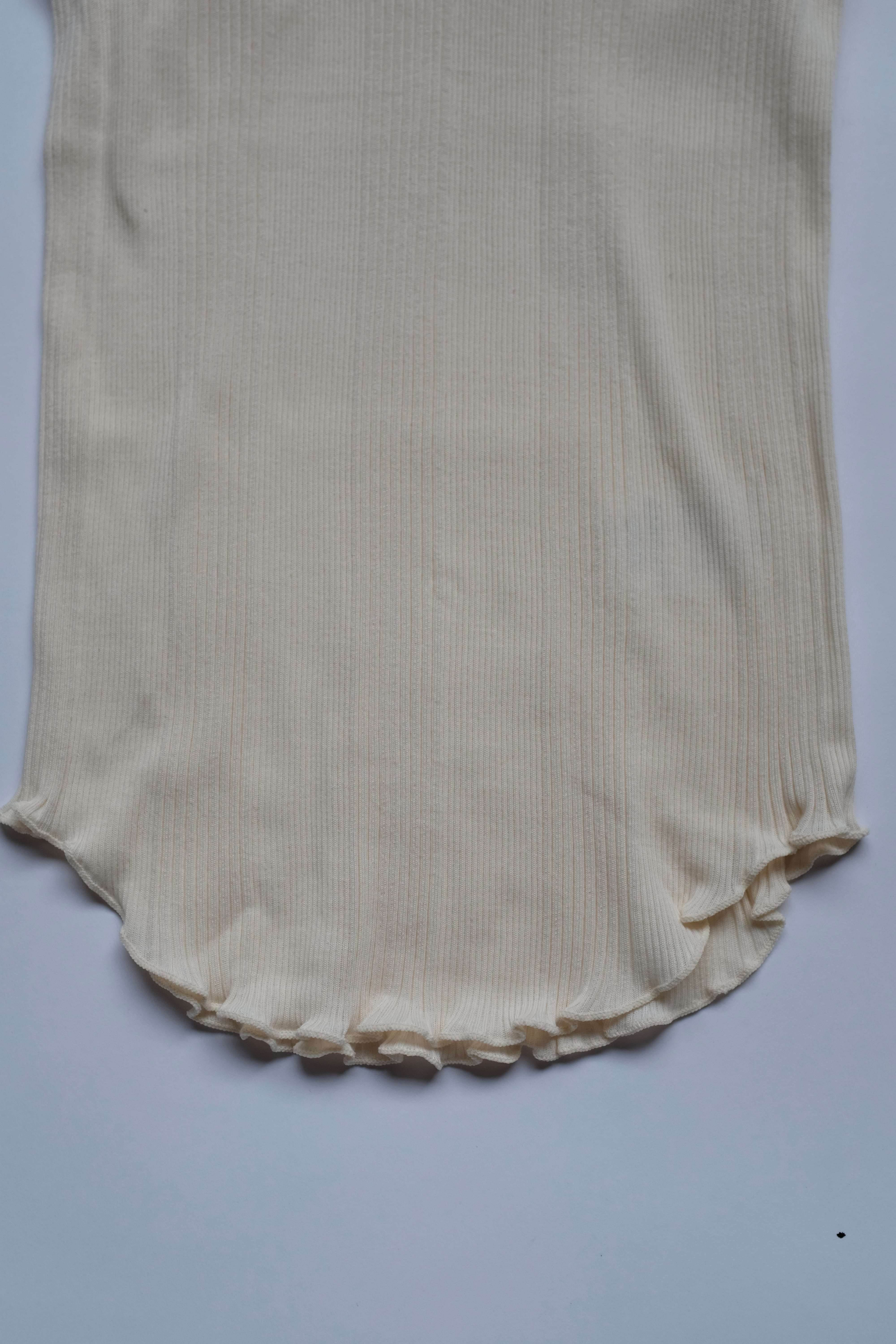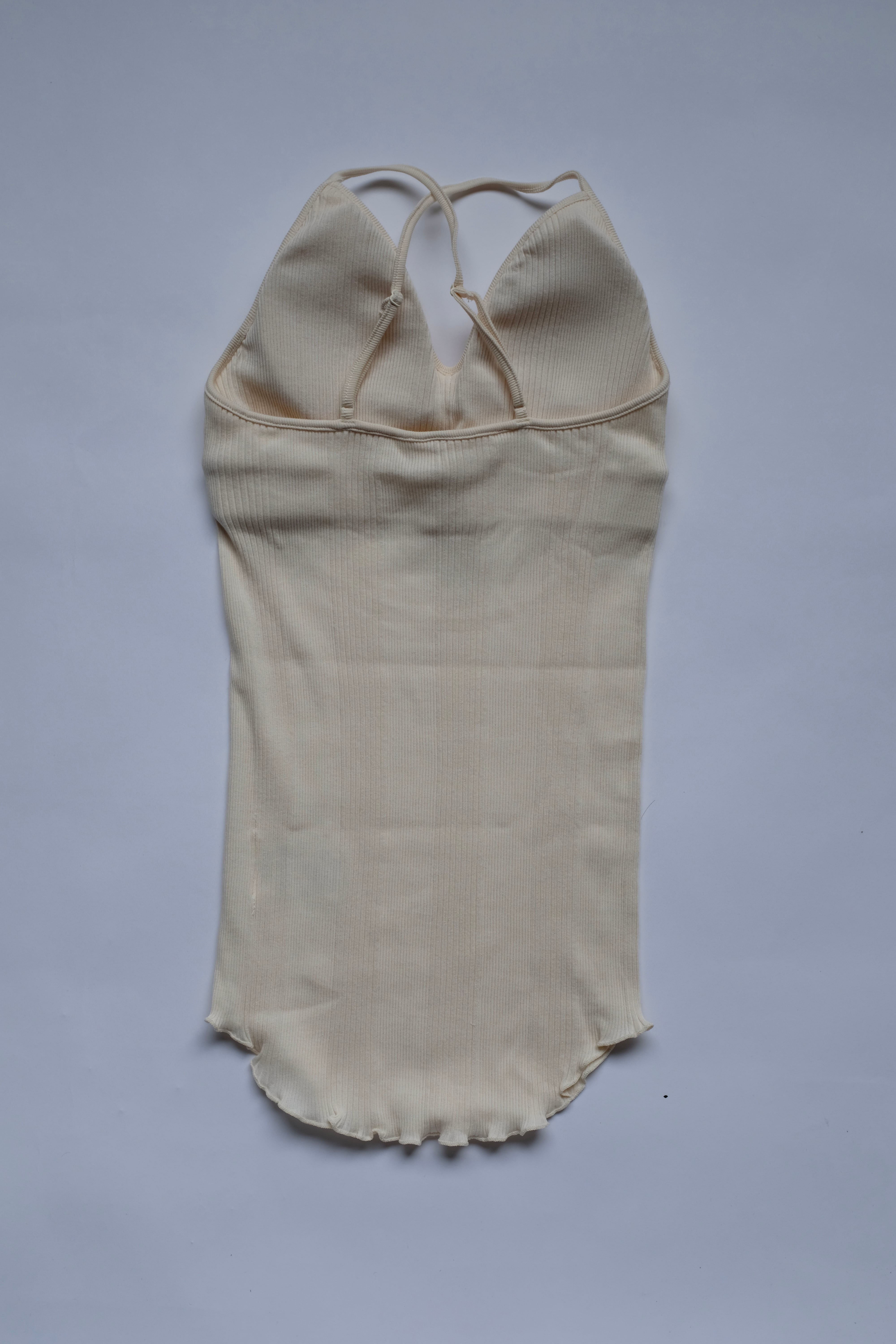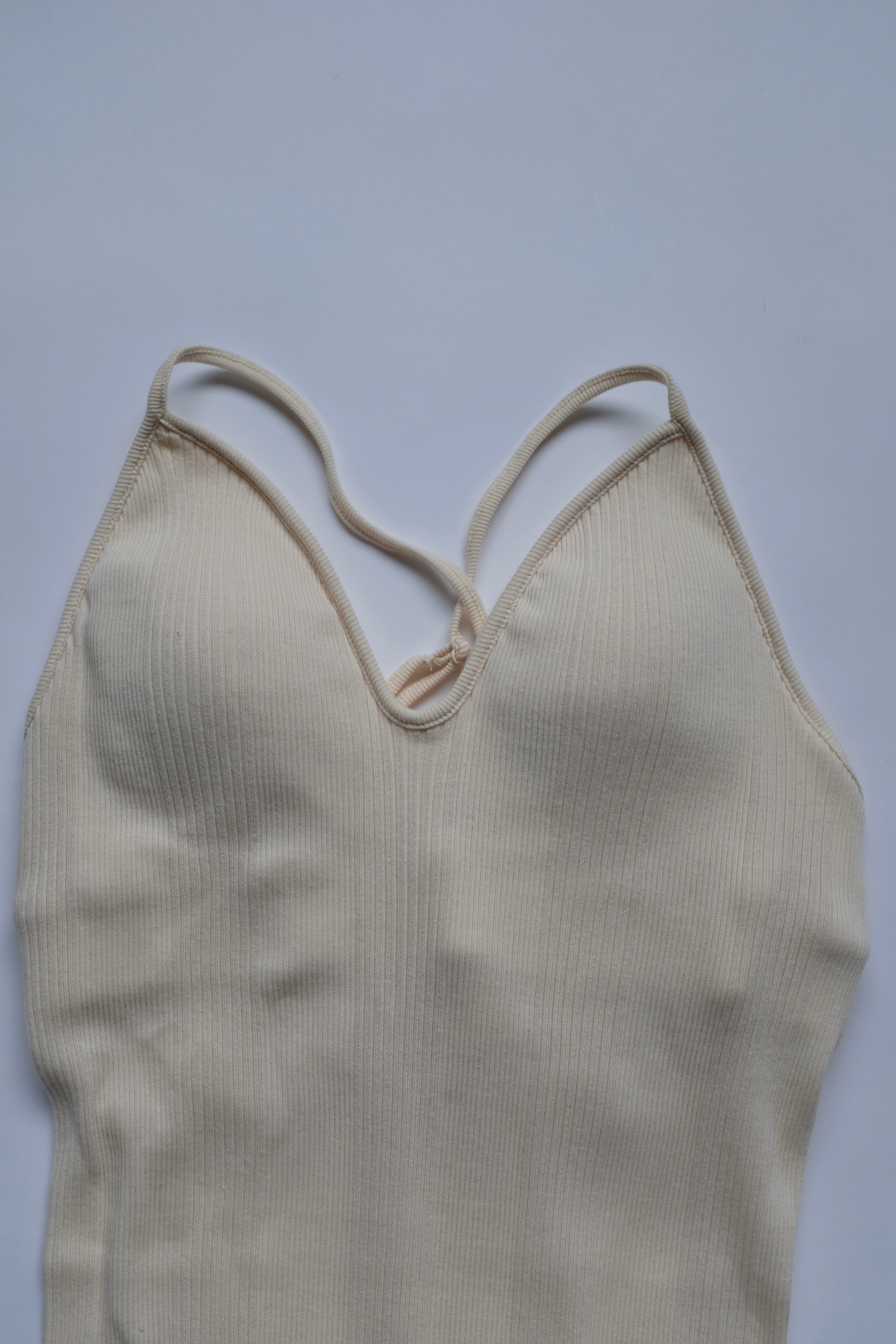繊細さを失わず、伸縮性を出すために稀少な極細4ミリ巾チェーンステッチ製法で仕上げています。細部までこだわりが詰まった渾身の一着です。肩のストラップはサイズアジャストなのでお好みの長さに調整できます。