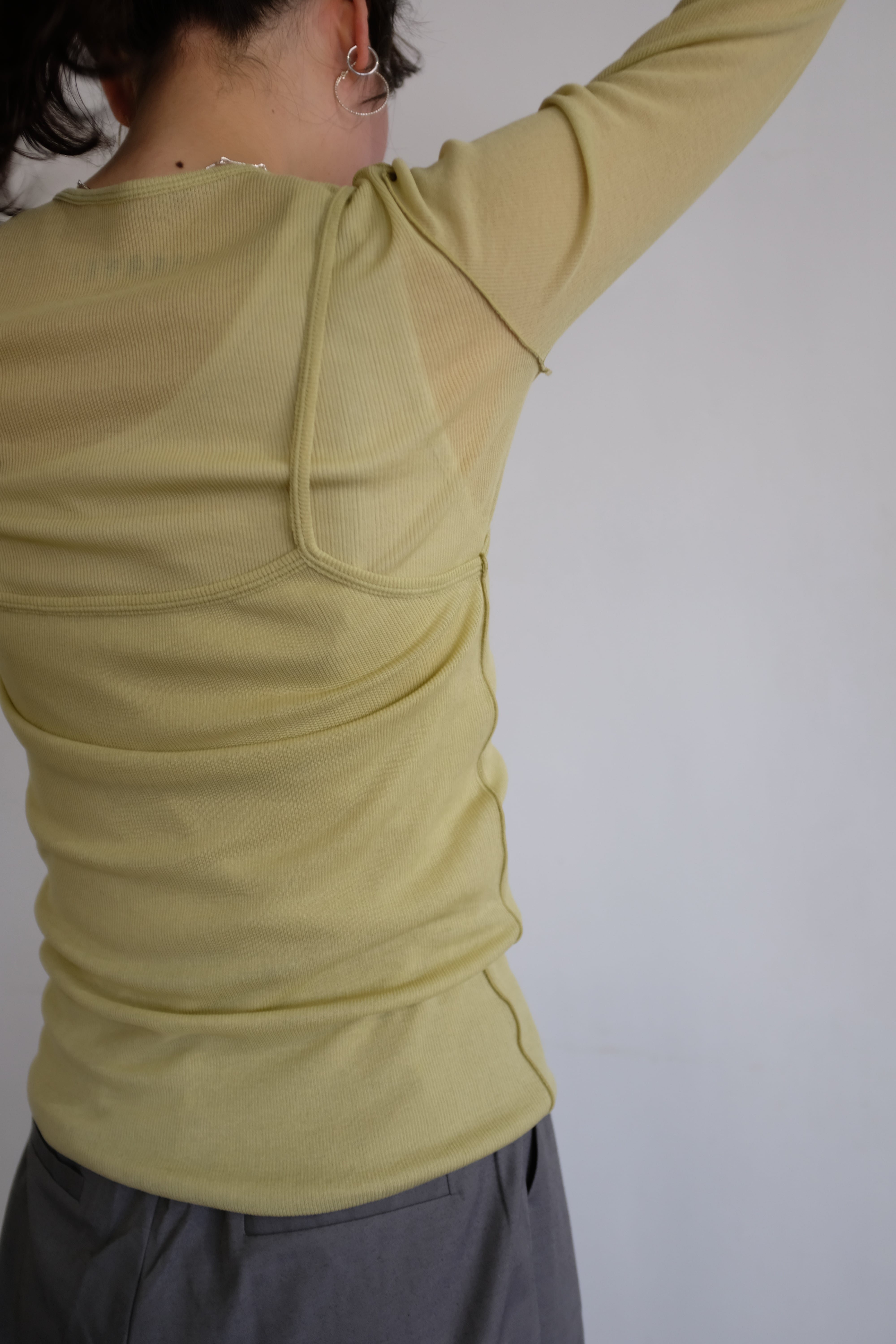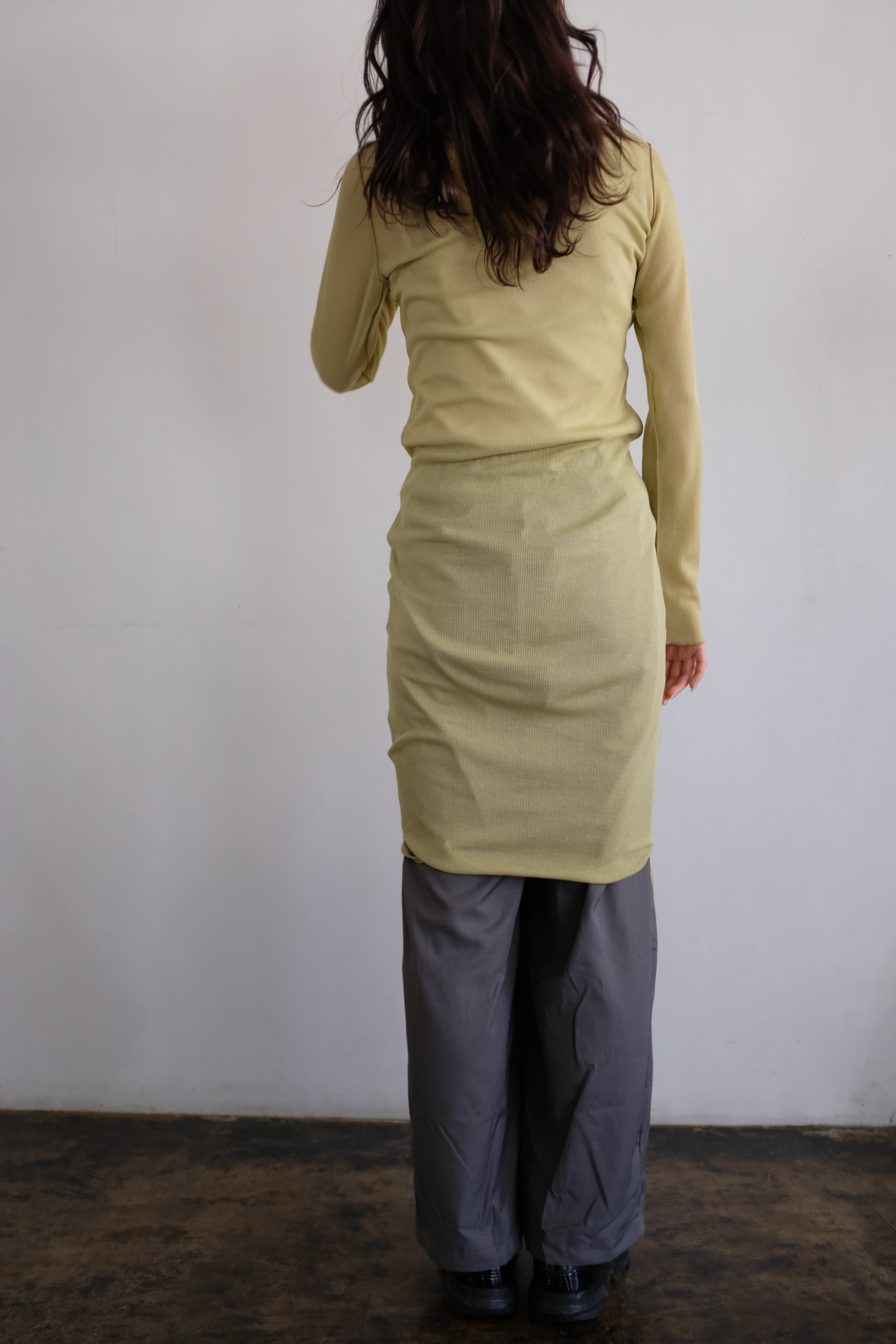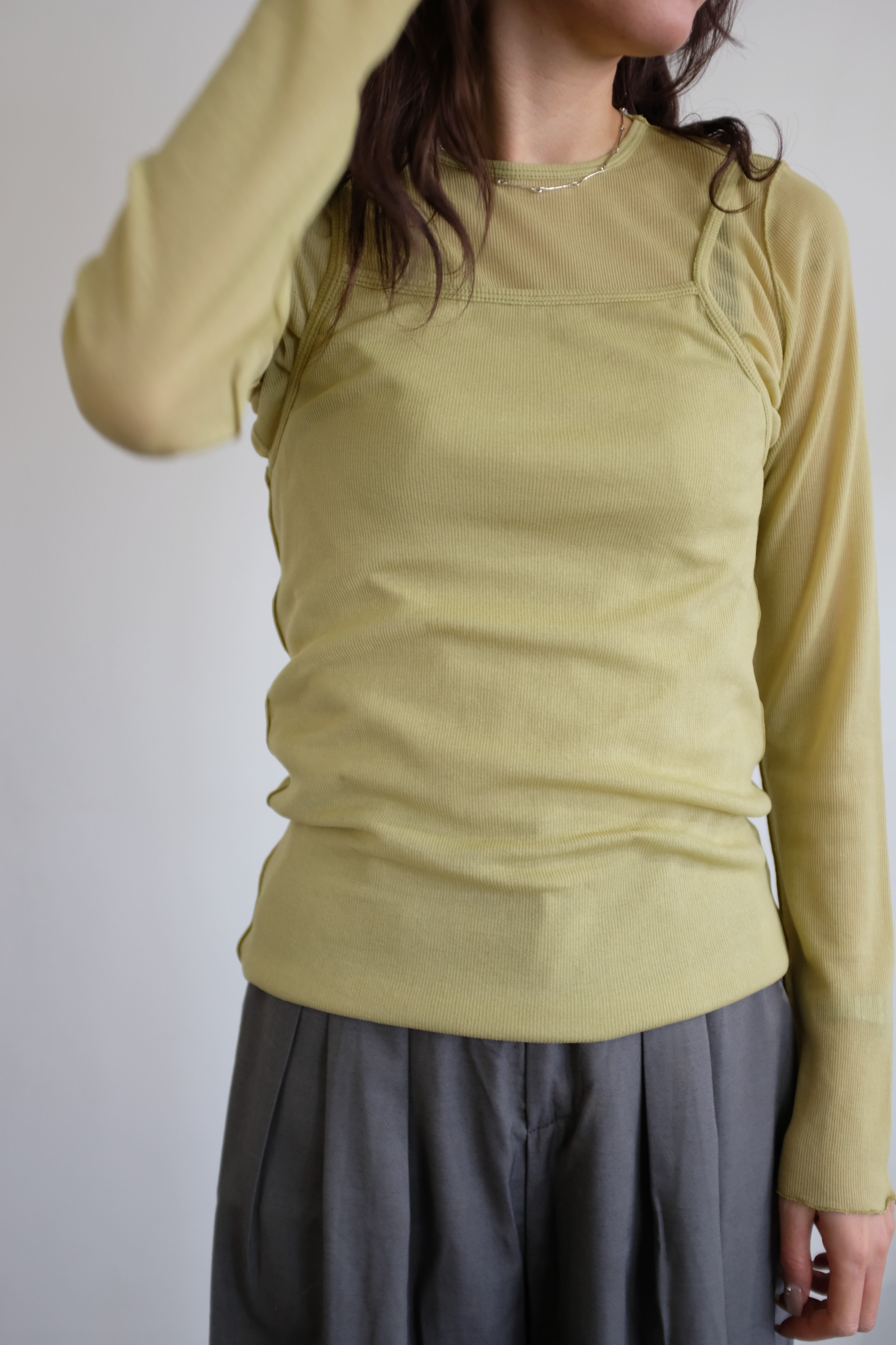 伸縮性に優れ、生地同士が張り付かないこの素材を生かしたレイヤードデザイン。