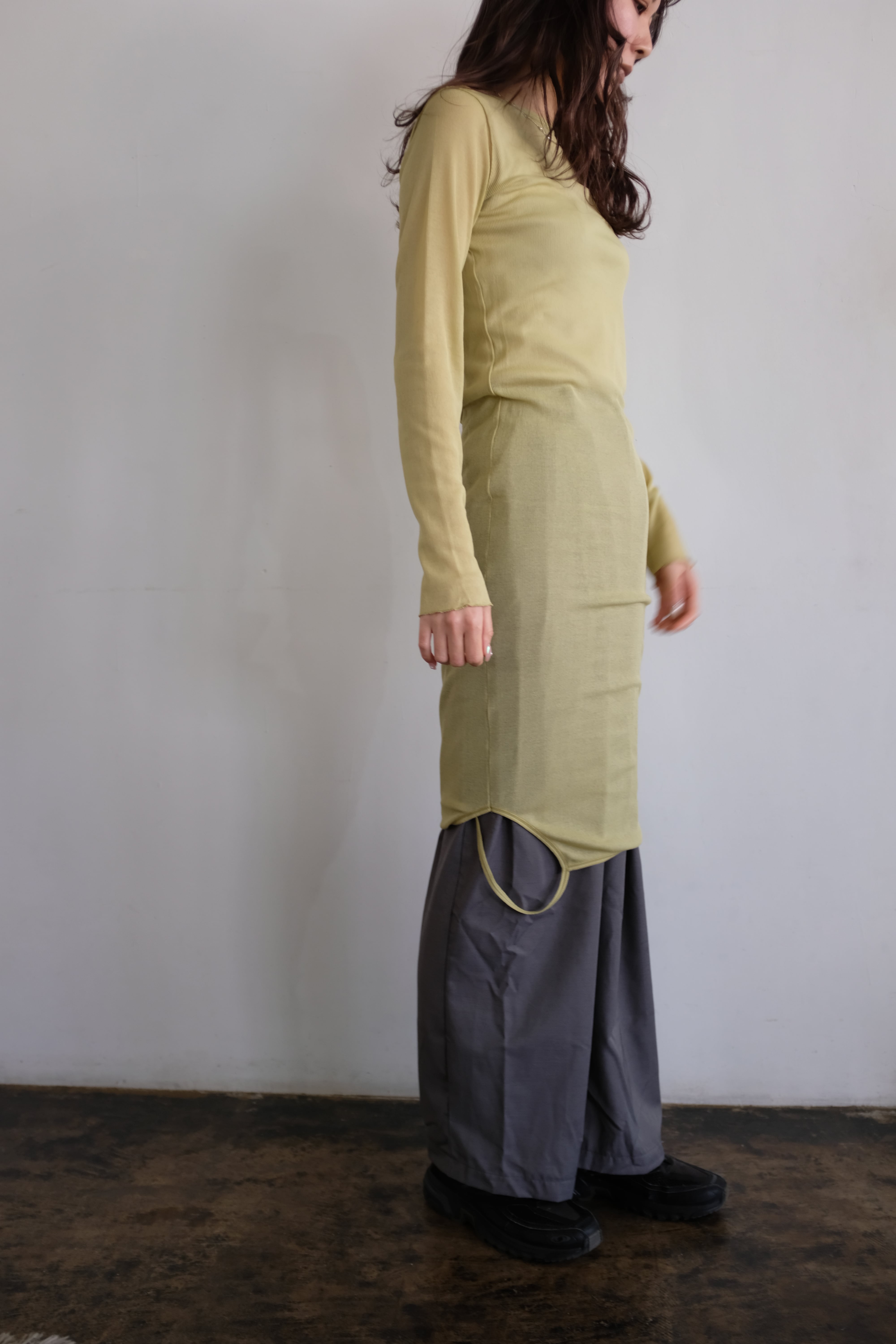 伸縮性に優れ、生地同士が張り付かないこの素材を生かしたレイヤードデザイン。
