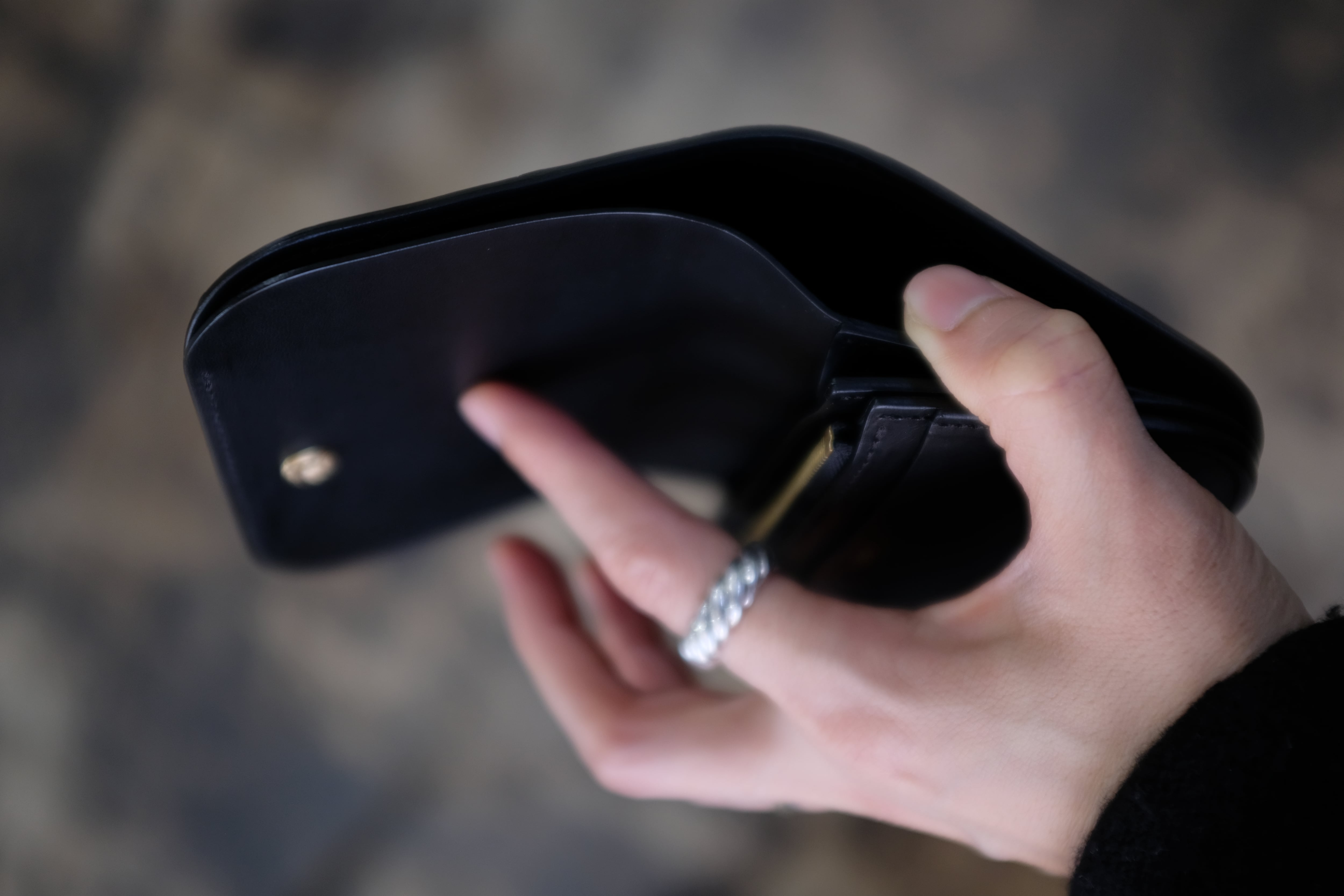 出し入れのしやすい縦型に使用する仕様で、小銭、カードもたっぷり入るようにしたコンパクト財布。