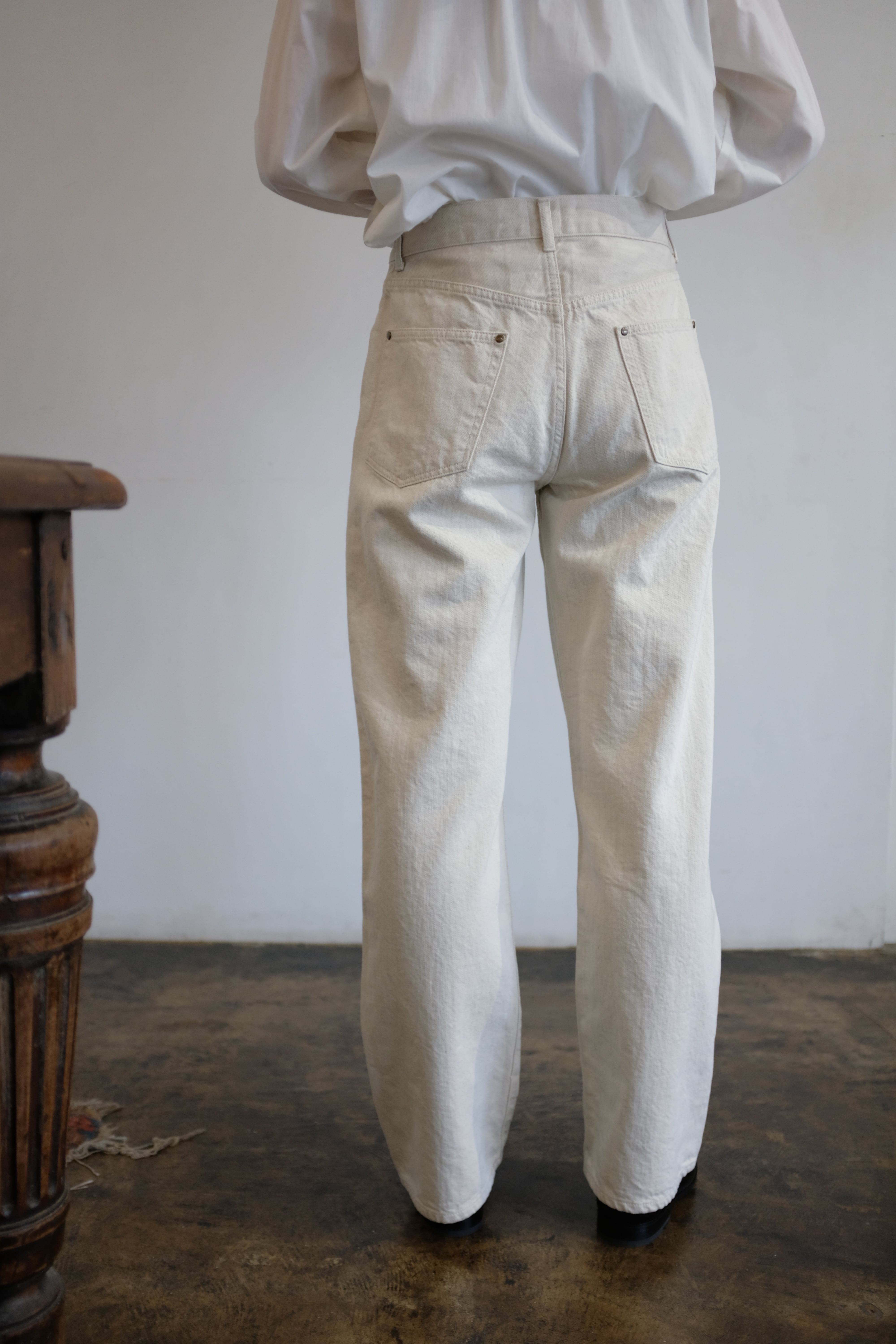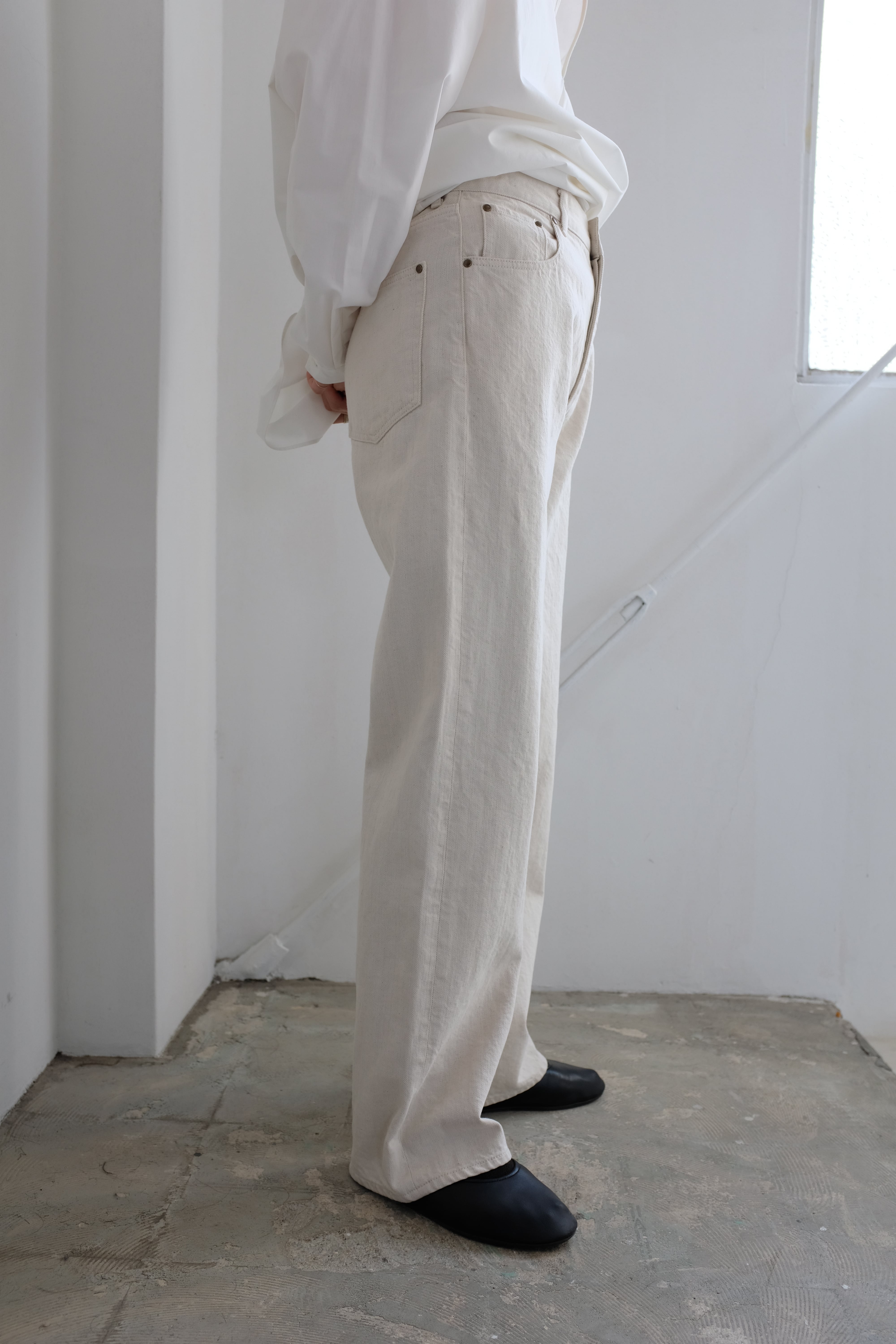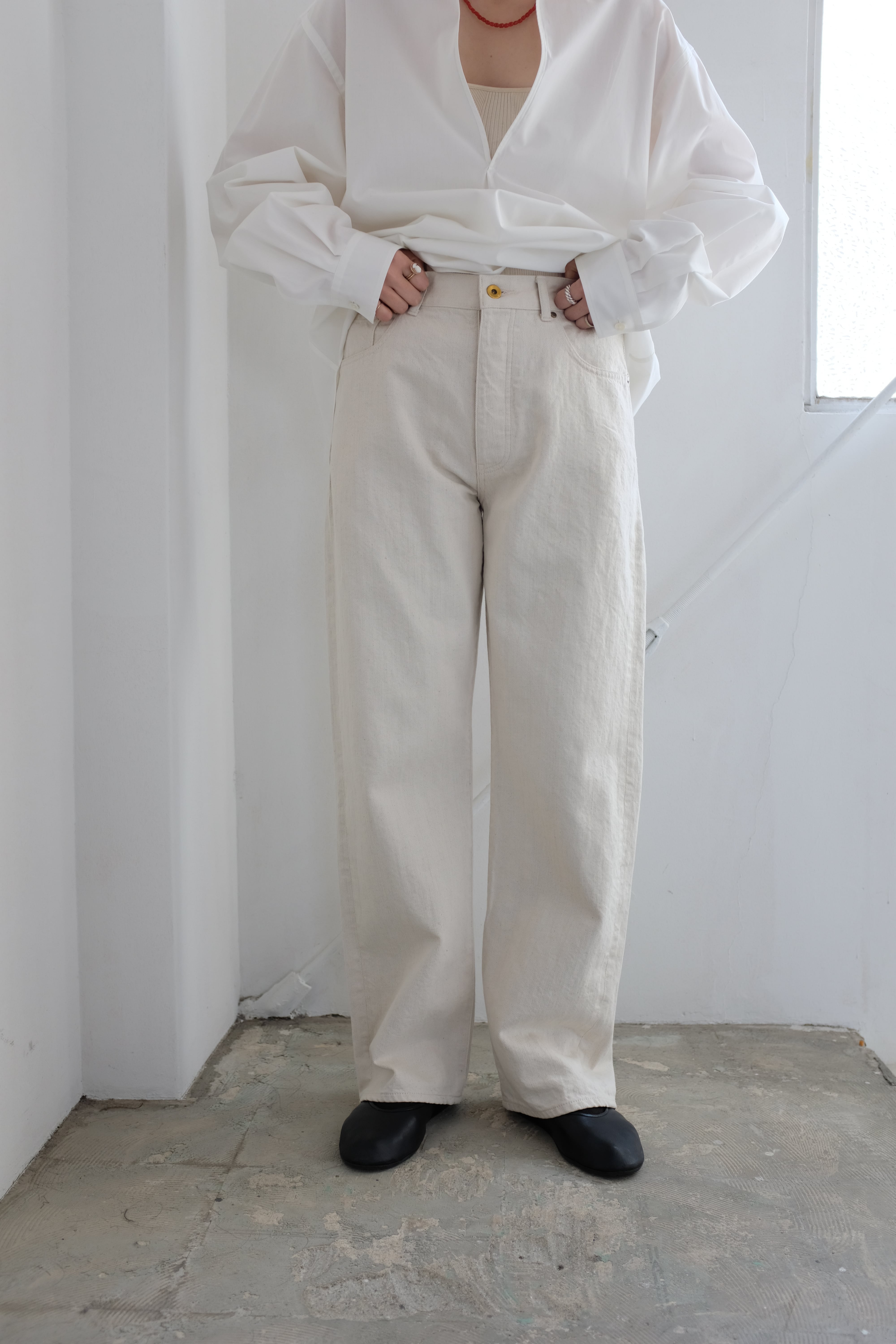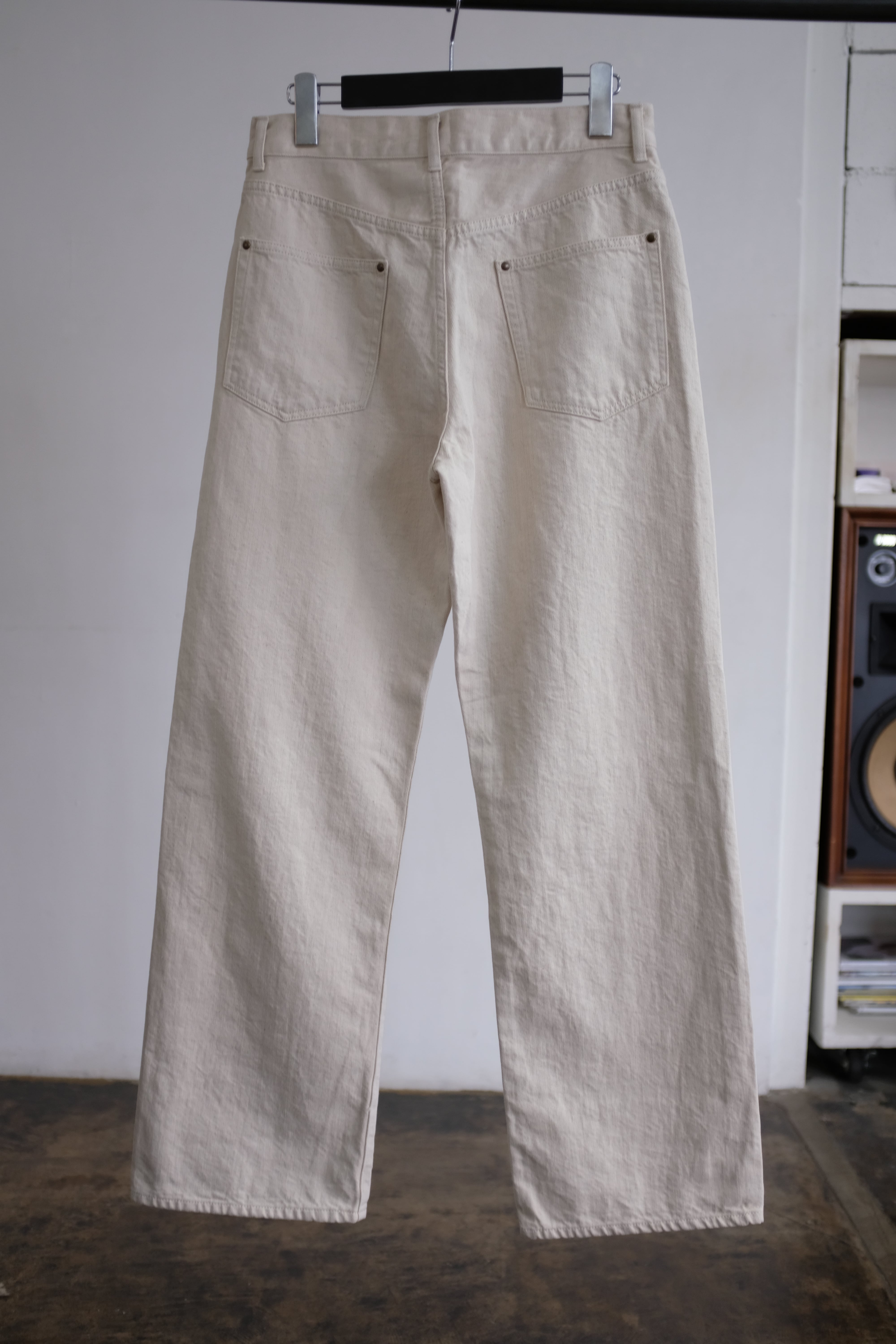 コットンヘンプのドライで表情のあるデニム地を加工し、落ち感がありライトオンスで柔らかい履き心地にしています。