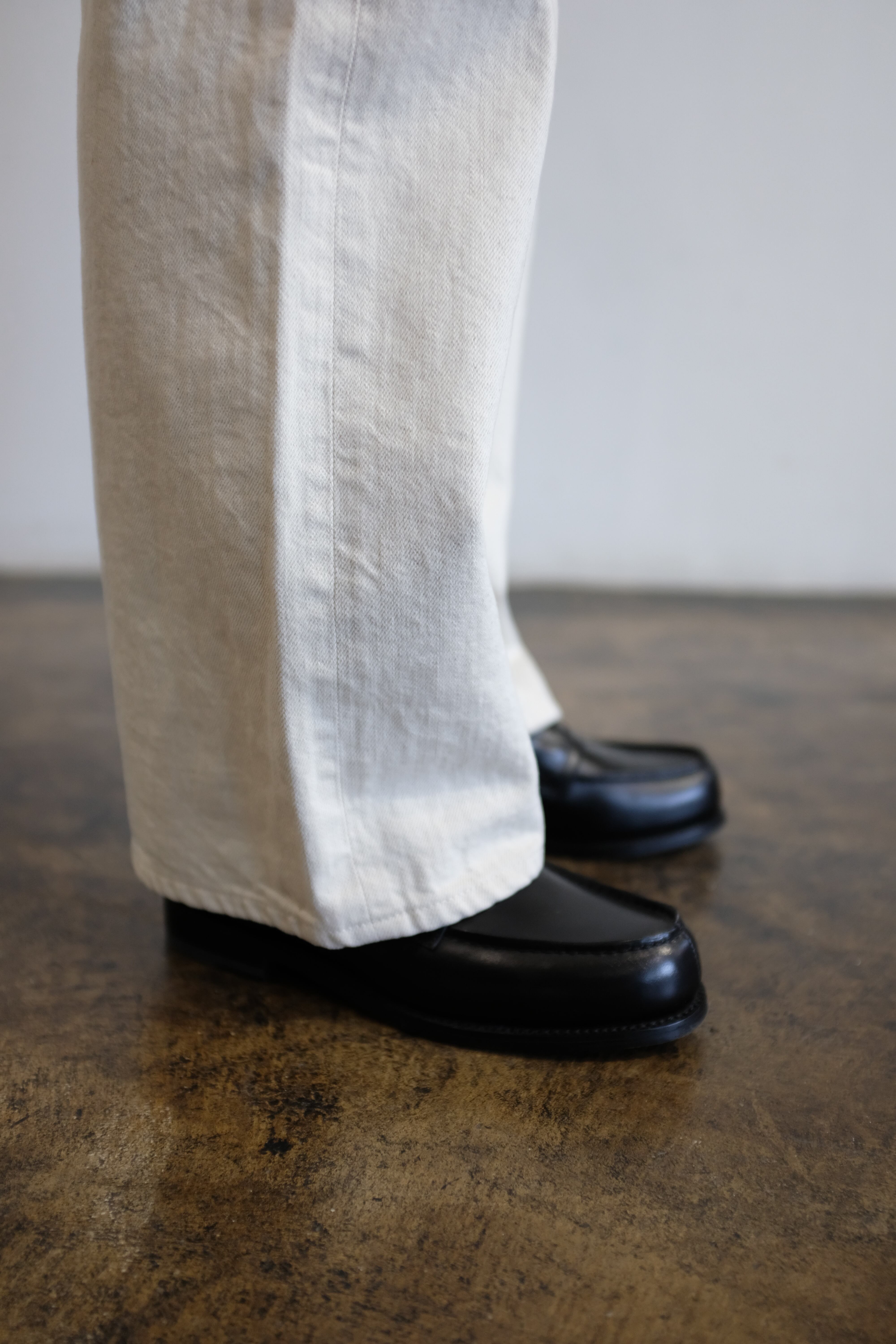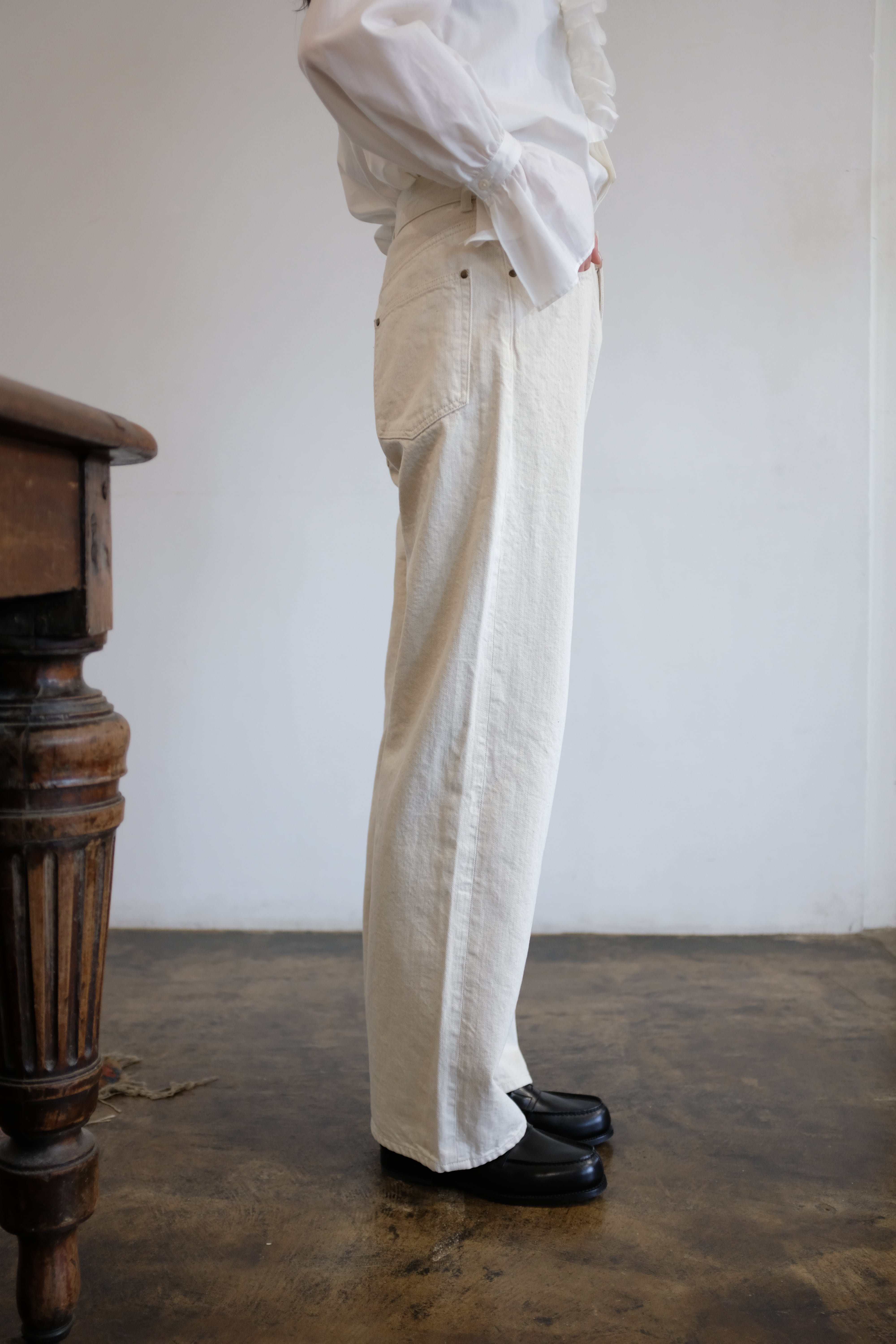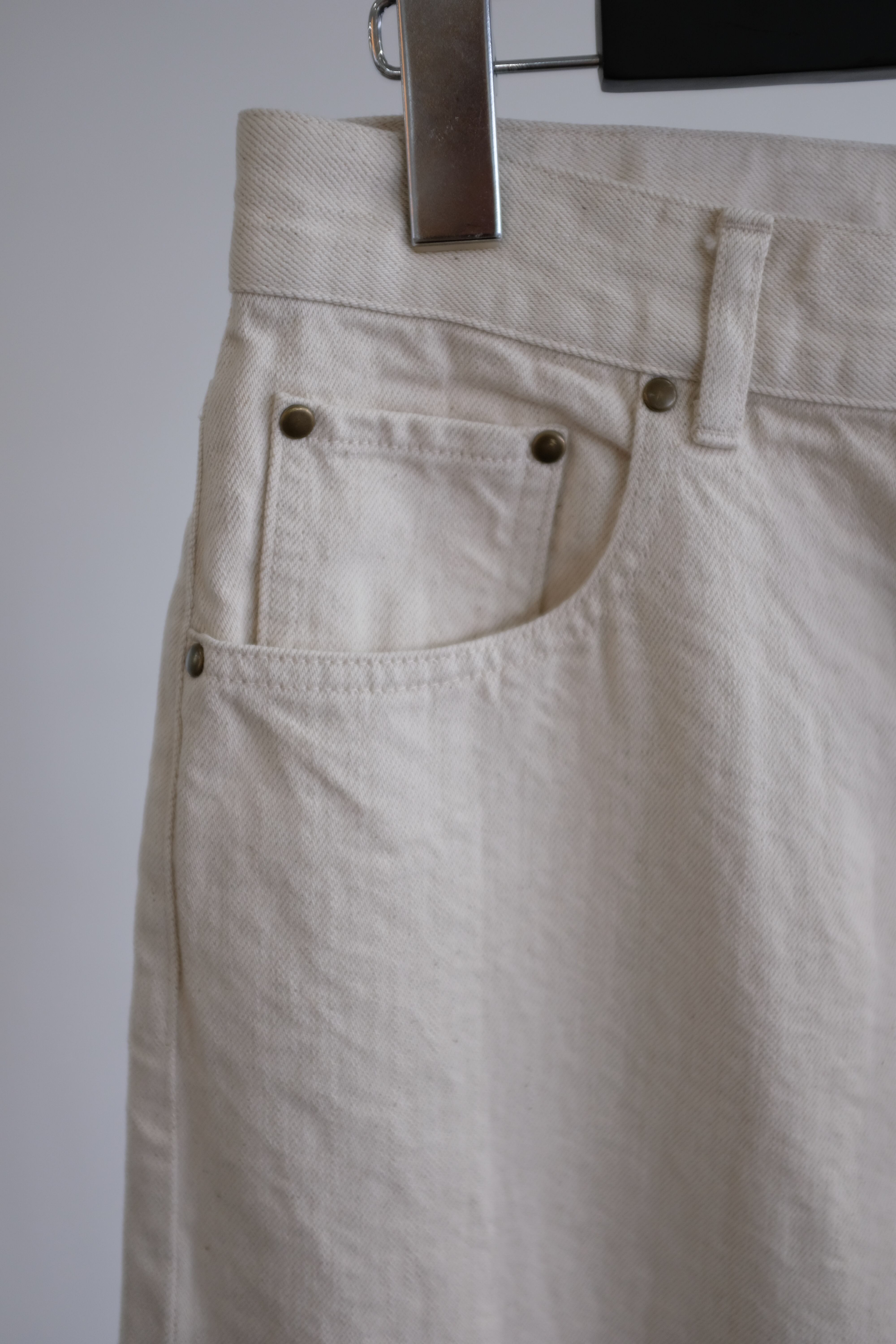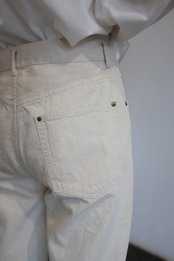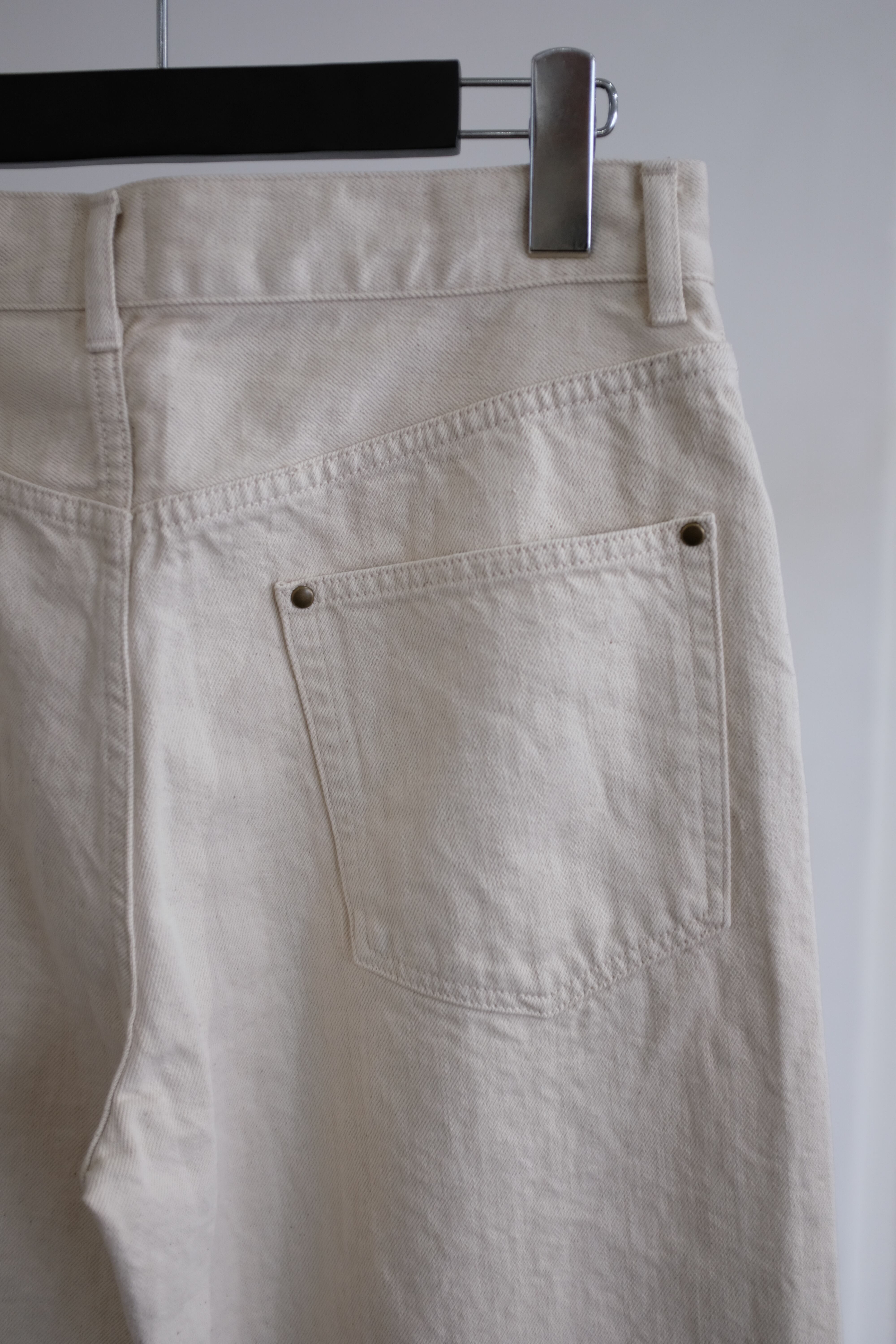 コットンヘンプのドライで表情のあるデニム地を加工し、落ち感がありライトオンスで柔らかい履き心地にしています。