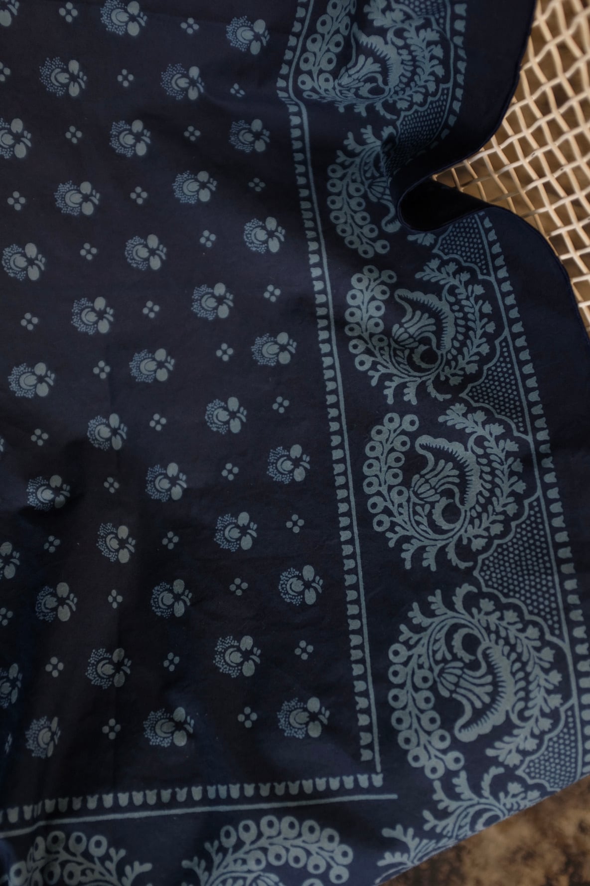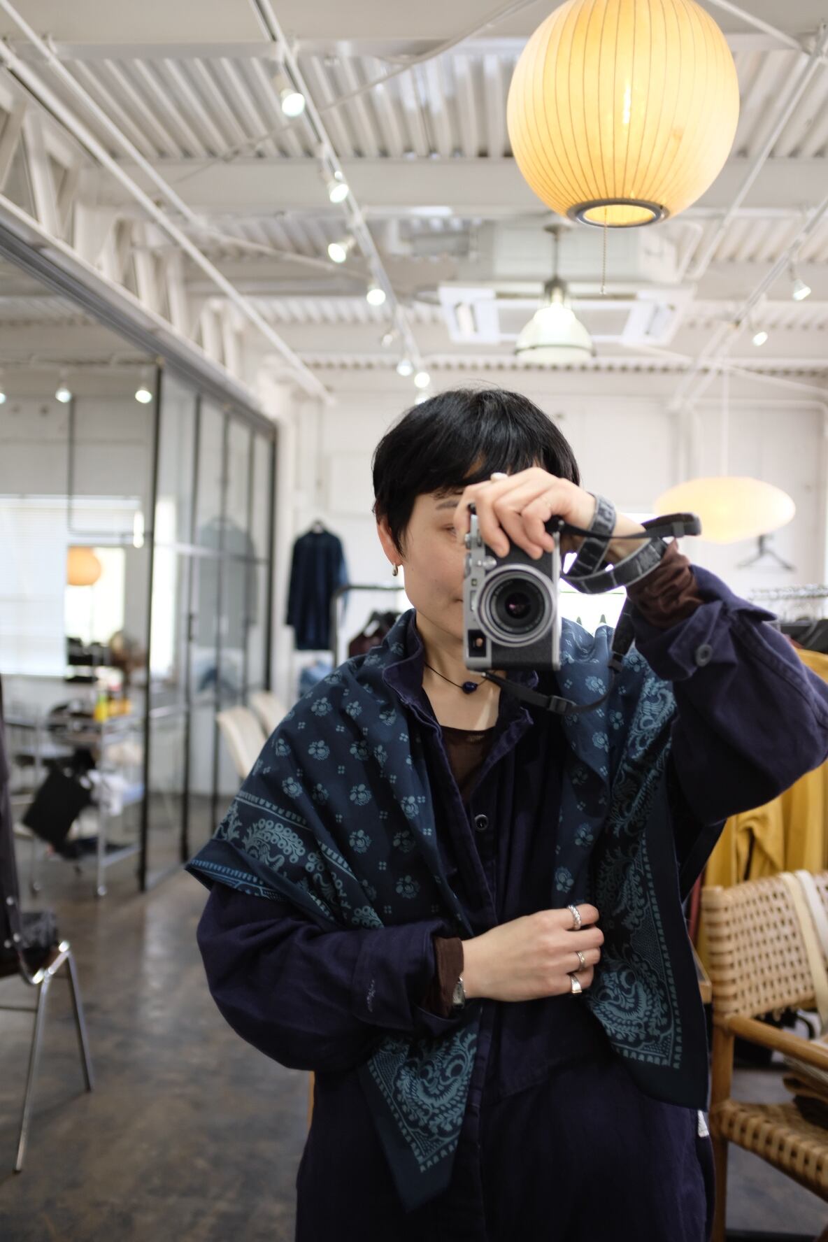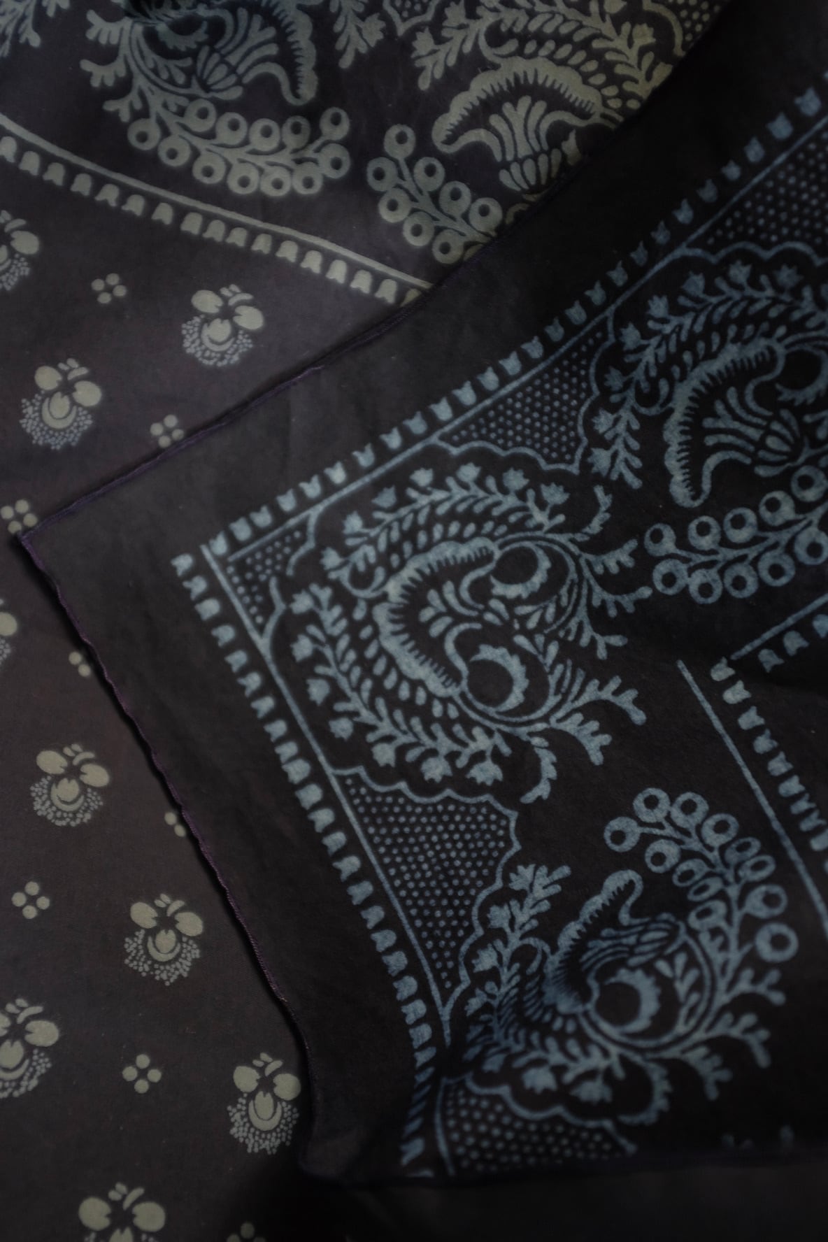 デザイナー自身がとても好きな19世紀フランスのインディゴの抜染プリントの大判ショールを元にオリジナルで生地を作成。当時のようなインディゴの色目に深みを持たせる為、可抜染料で