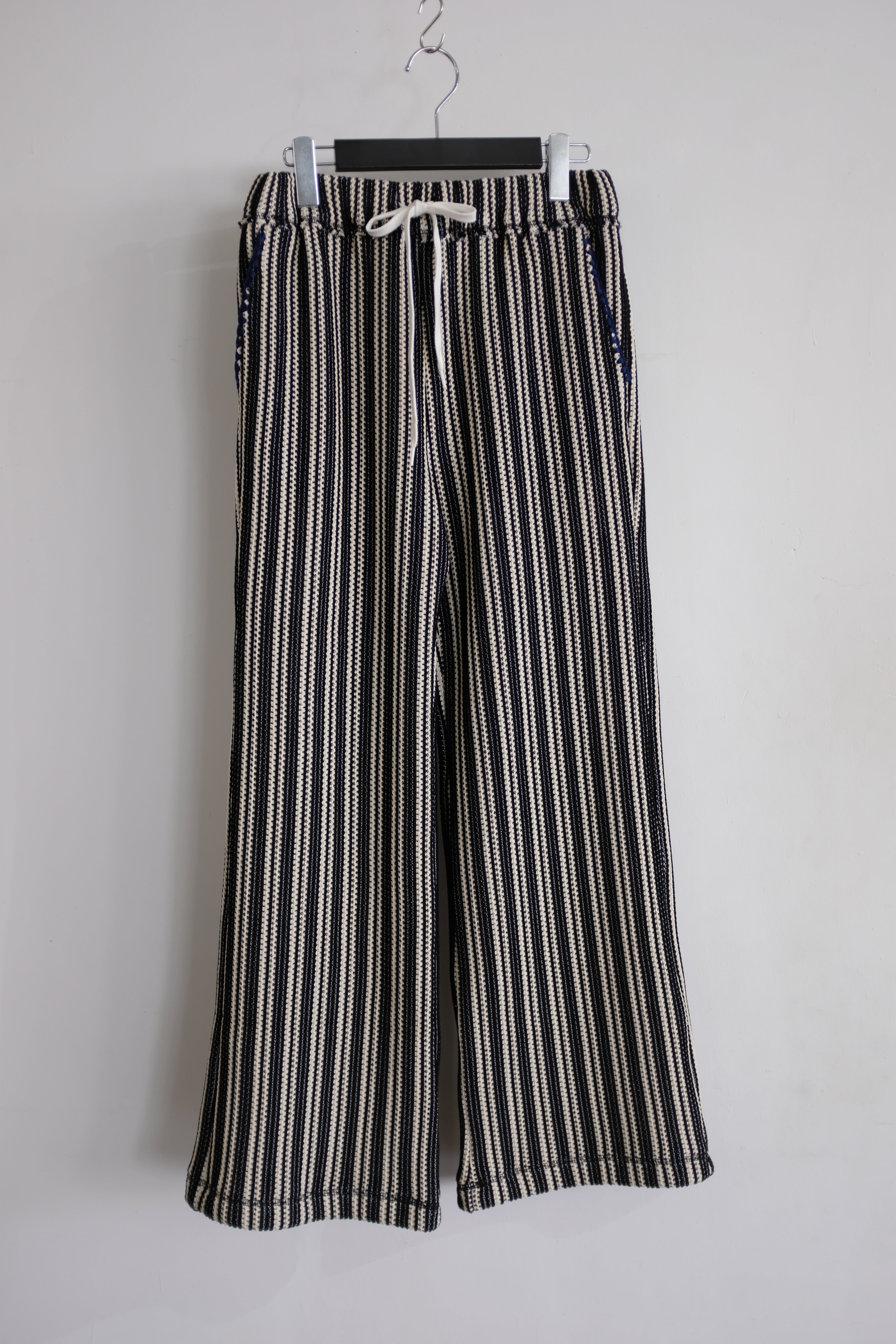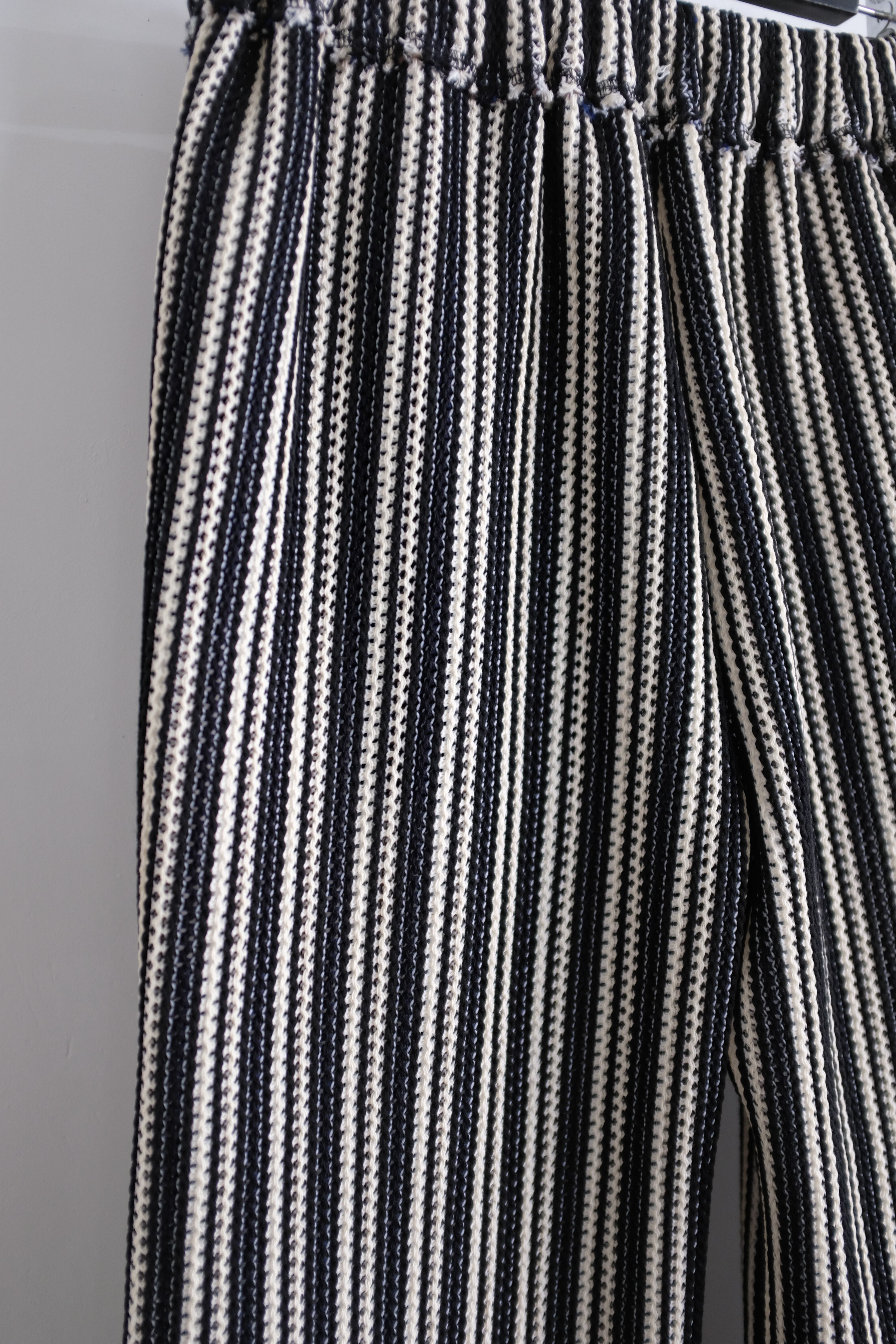 軽いニットのような夏らしいイージーパンツ。伸縮性もあるのでストレスなくきていただけます。