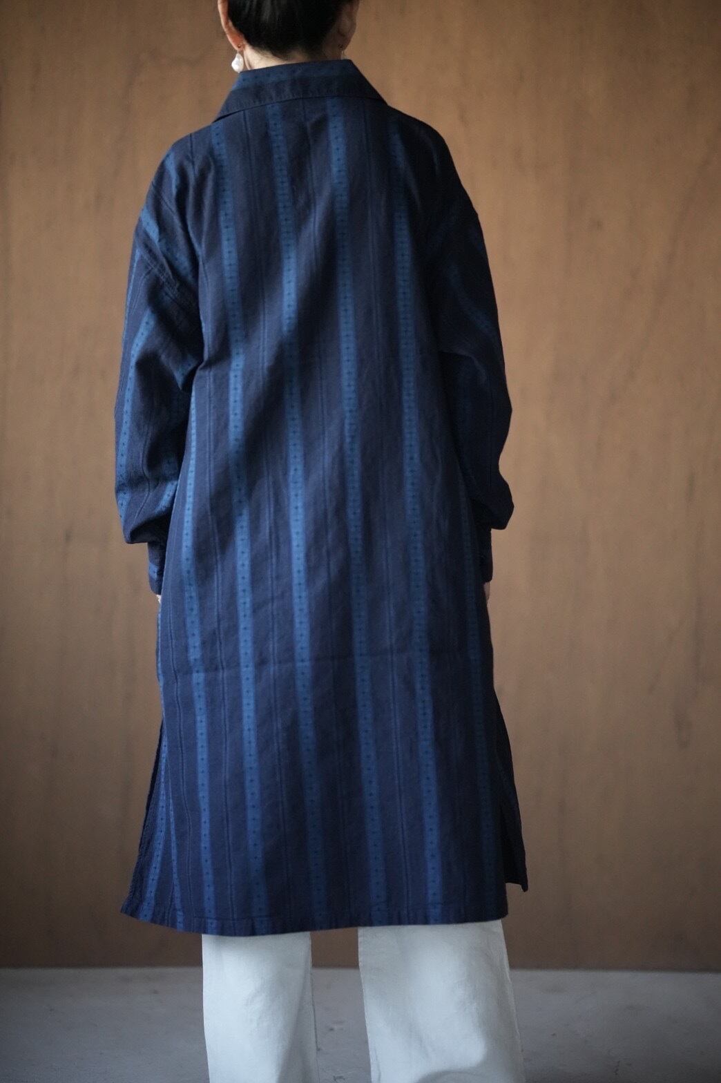 縦糸に横糸とも異なる色のインディゴ糸を使用し、柄を表現したOUTILオリジナルの生地は