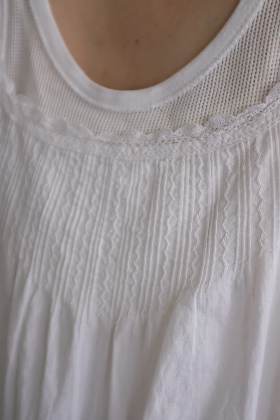 首周りの刺繍やレースが可愛い一着。裾にかけてAラインのシルエットになります。
