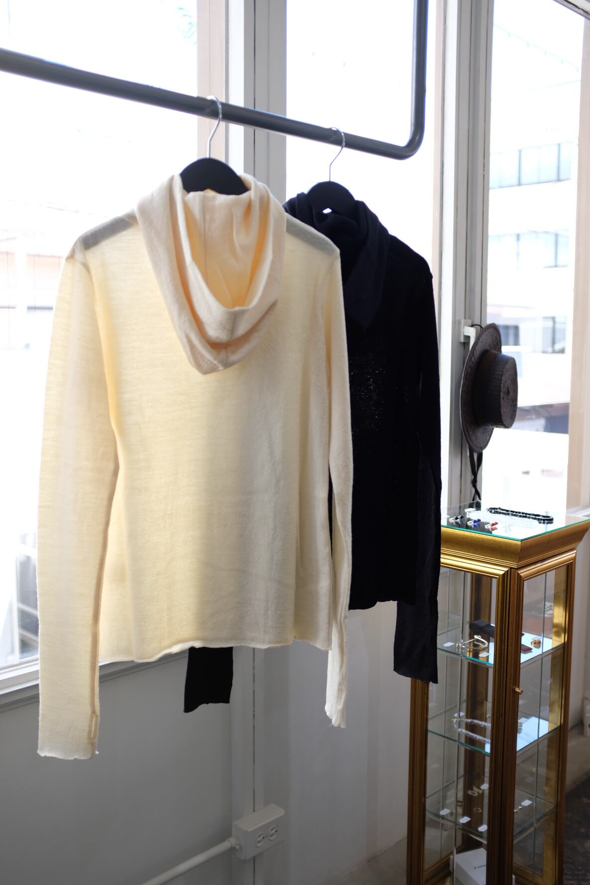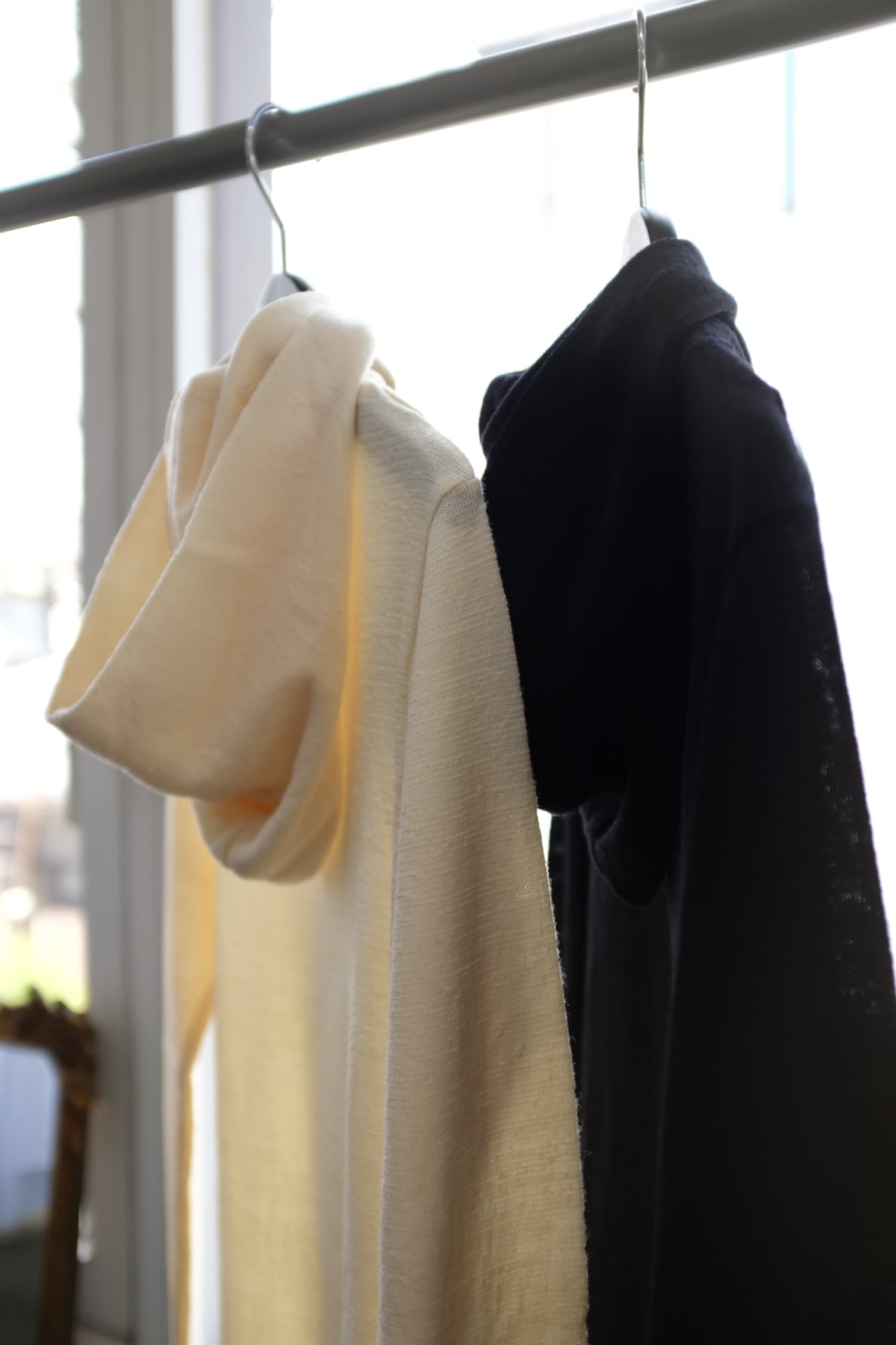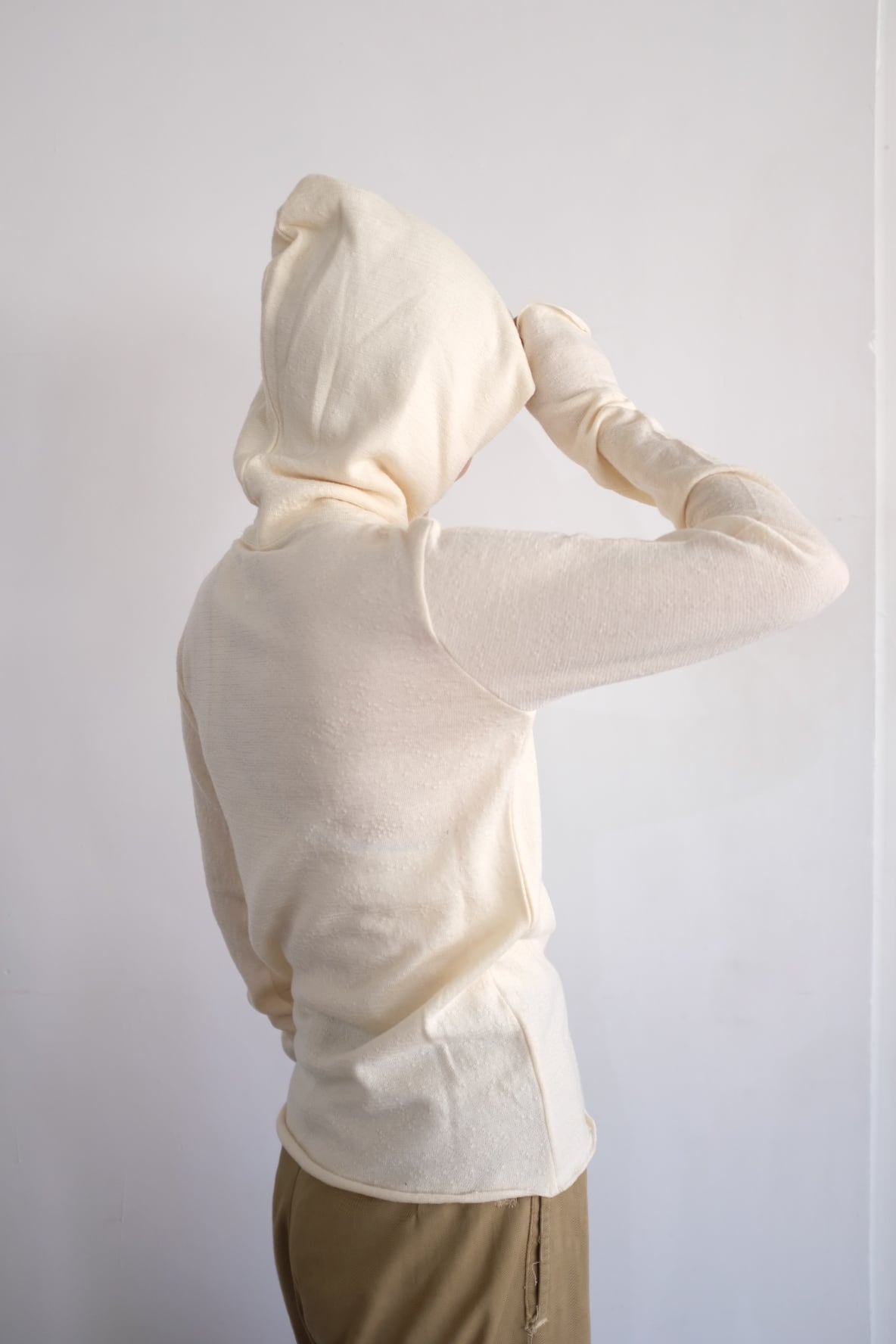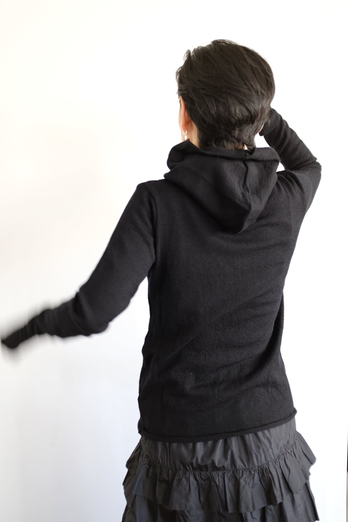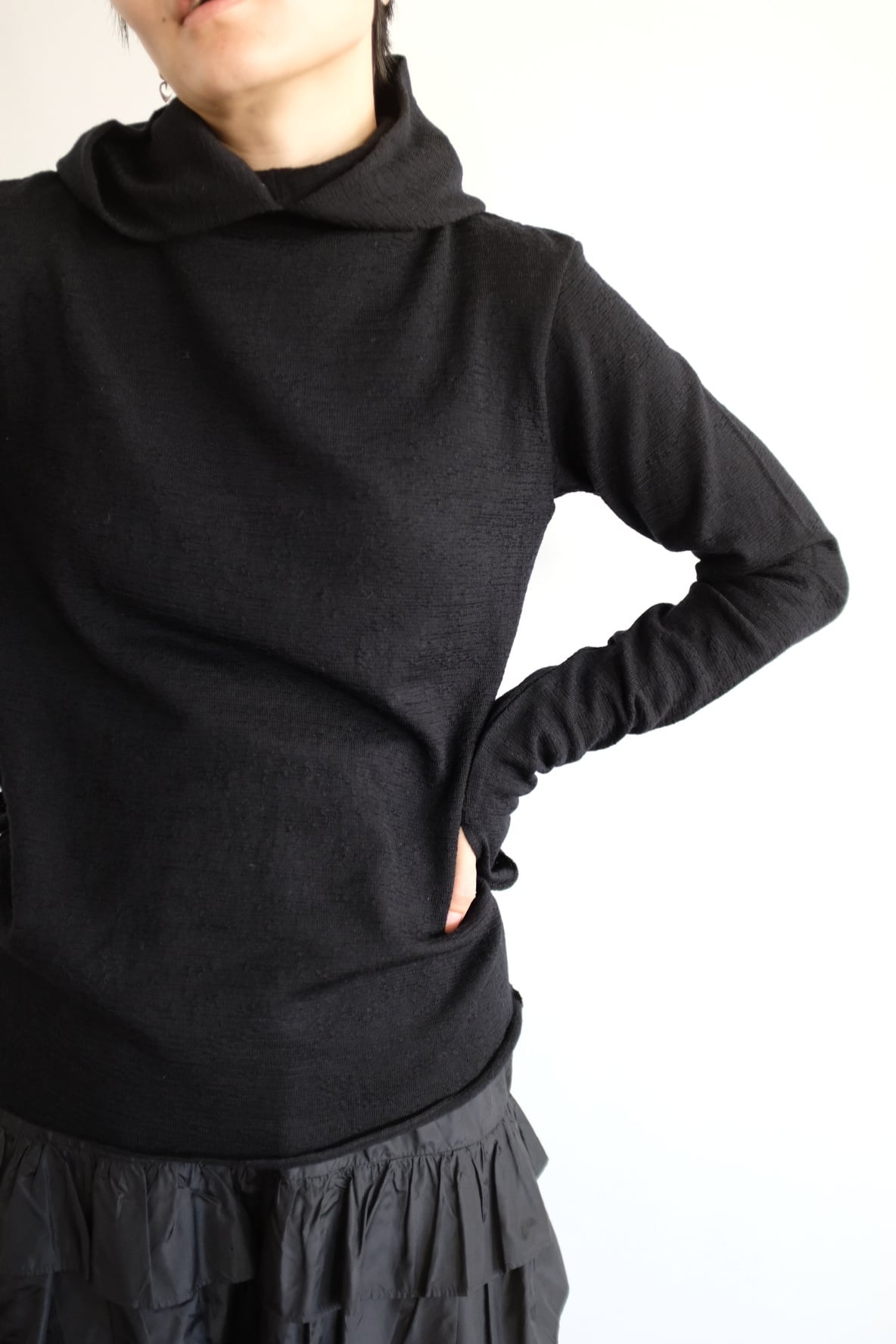 タートルにフードをつなげ、フーディほどカジュアルすぎず、タートルほどクラシックすぎない間を目指して作りました。