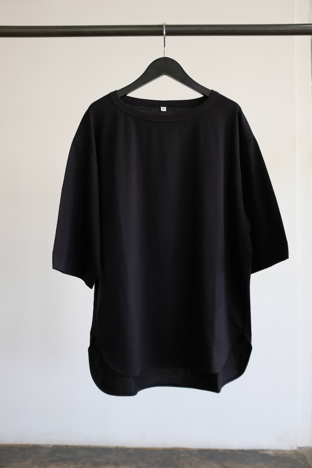 ハリ感がありながらも、しなやかな風合いを併せ持つコットン天竺を使用した5分袖Tシャツ。 オーバーサイズシルエットで裾はラウンドデザインを採用。 大人ルーズなTシャツは色んなコーディネートに重宝する一枚です。 color Black 素材 Cotton100% 原産国 日本 size Free 天幅 22cm 肩幅 53cm 袖丈 30cm 身幅 60cm 着丈 70cm ----------------------------------------------------------------------------------- 実店舗との同時販売を行っておりますので ご注文を頂いたお品をご用意できない場合もございます。 予めご了承くださいますようお願いいたします。 銀行振込をご希望の方は直接店舗へDMにてお問い合わせください。 [配送について] ご注文のお品は佐川急便にてお送り致します。 ご入金より3日以内に指定なしにて発送させて頂きます。 [返品・交換について] お客様都合の返品・交換は不可になります。